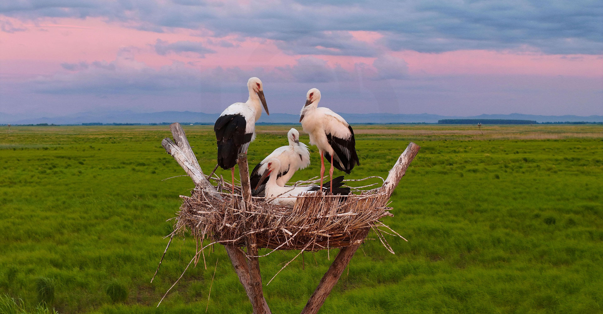 Oriental white storks in an artificial nest at Sanhuanpao National Nature Reserve, in Fujin City, northeast China’s Heilongjiang Province