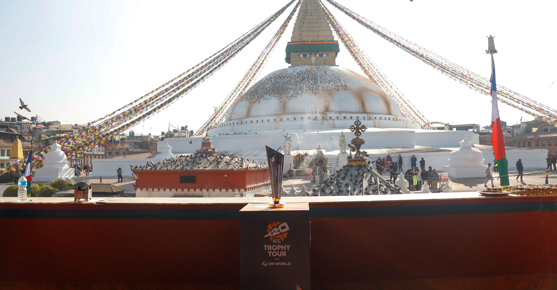 टी–२० विश्वकप ट्रफी बुधबार काठमाडौंको बौद्धनाथ स्तूप परिसरमा प्रदर्शन गरिएको छ ।