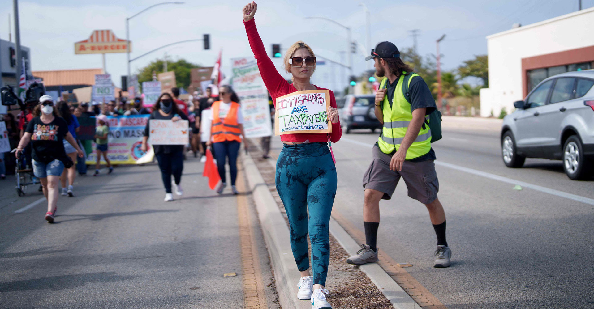 People attend a rally and march on July 11, 2025 in Oxnard, California. The rally and march came a day after around 200 people were detained by federal officers during a raid at a cannabis farm in nearby Camarillo