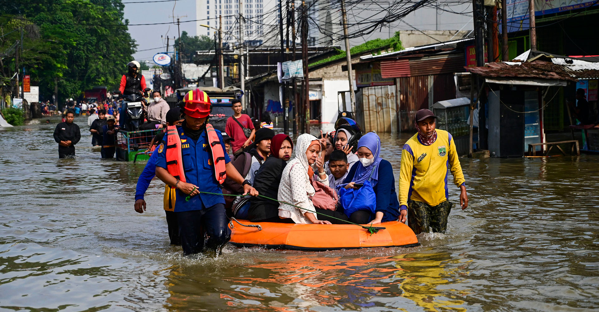 Rescuers help residents evacuate after heavy rain in Tangerang, Banten province, Indonesia