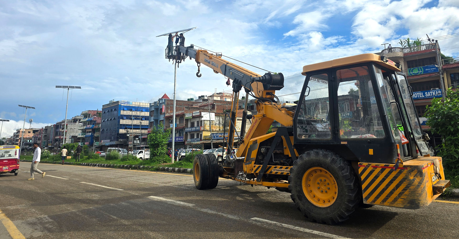 सुर्खेत वीरेन्द्रनगरस्थित रत्नराजमार्ग अन्तर्गत जुम्लारोडमा सोलर बत्तीहरू जडान गर्दै श्रमिक । अहिले नगरपालिकाले धुलियाबिट चोकदेखि बाङ्गेसिमलसम्म सोलार बत्ती जडान गर्न सुरु गरेको छ