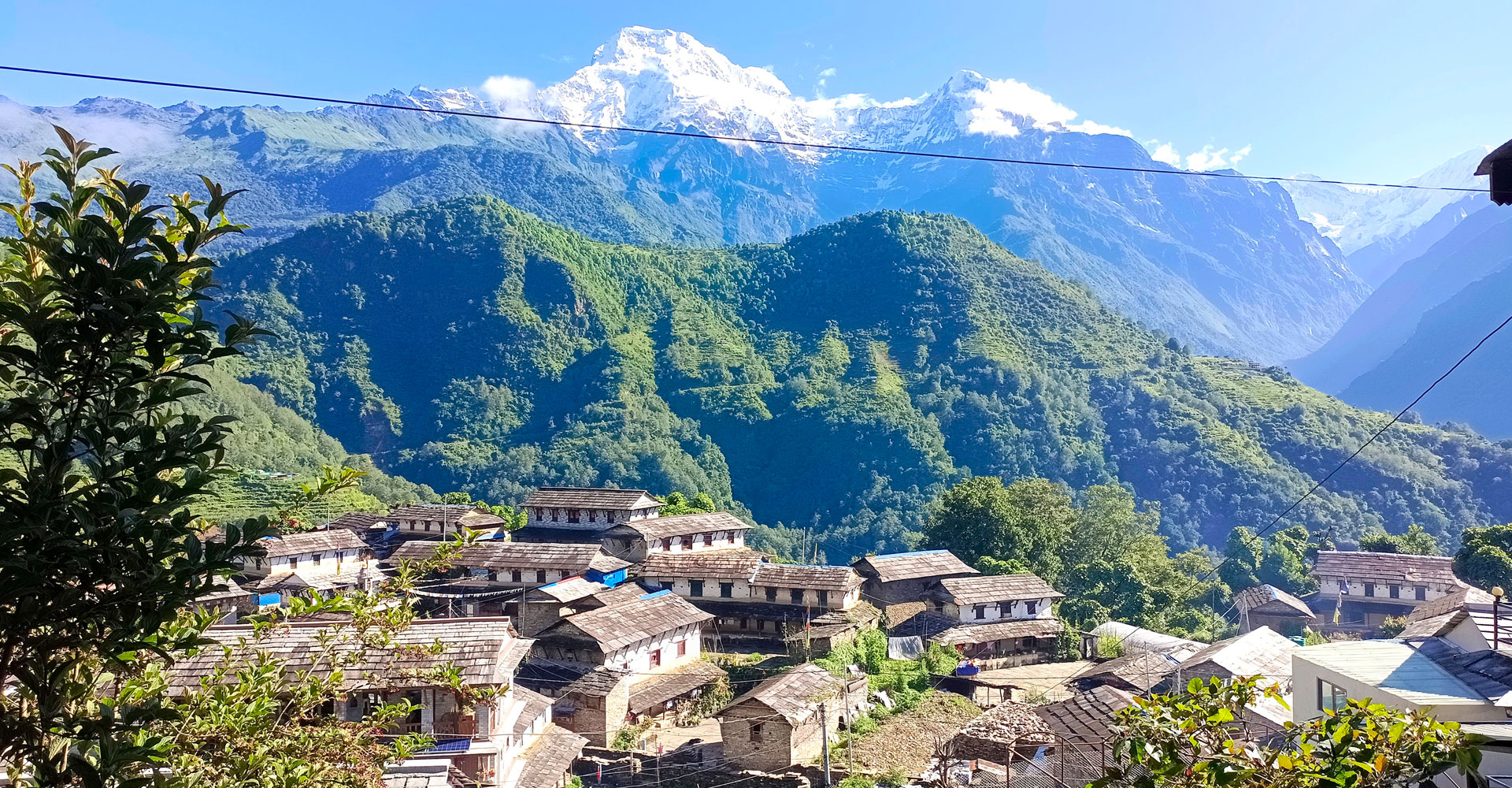 कास्कीको अन्नपूर्ण गाउँपालिकाको पर्यटकीय गाउँ घान्द्रुकको वडा नं ११ डाँडागाउँ र पृष्ठभूमिमा हिमाल