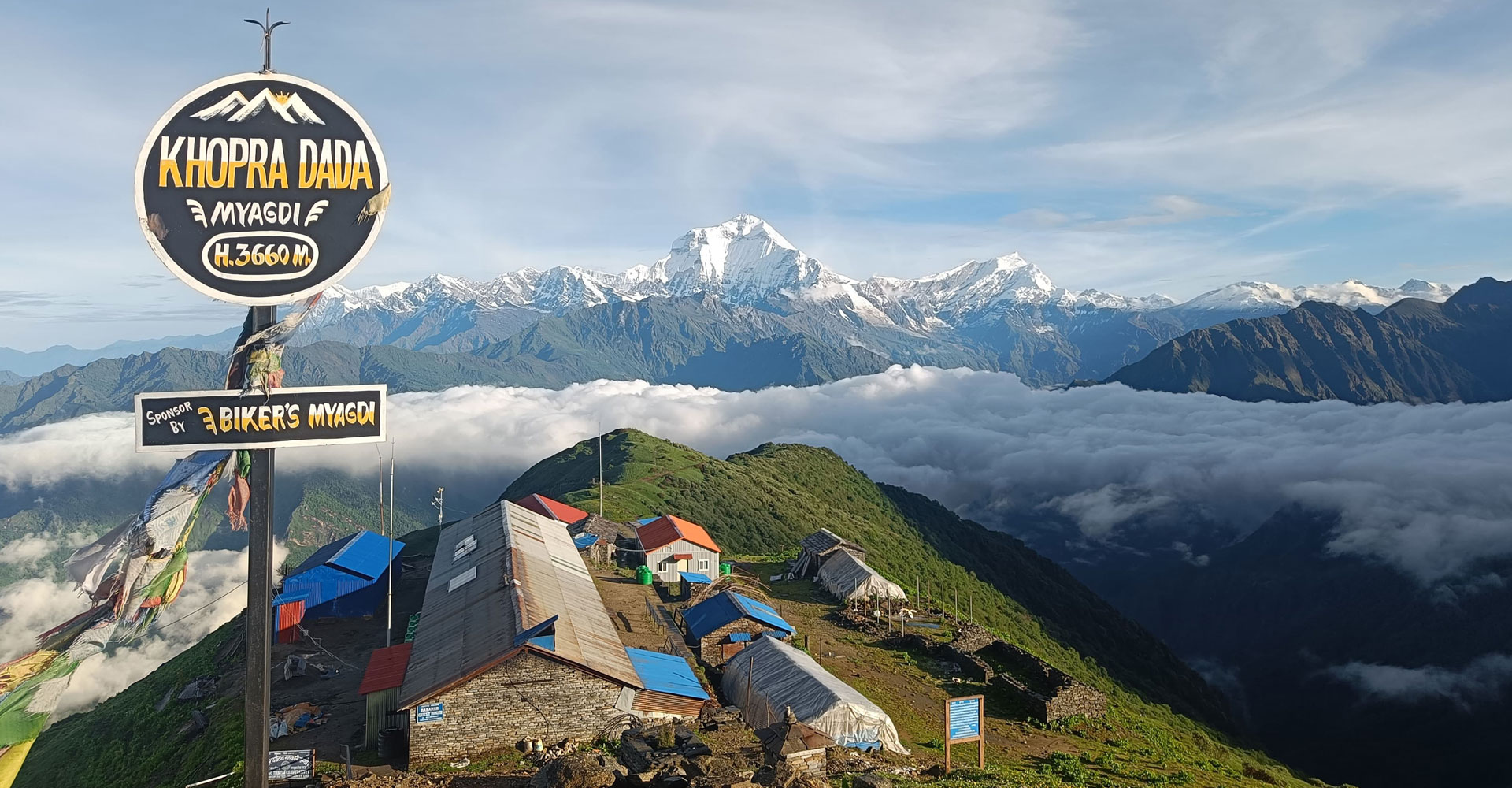 म्याग्दीको अन्नपूर्ण गाउँपालिका–५ खोप्रा (खोपारा) लेकबाट देखिएको धौलागिरि हिमशृङ्खला । समुद्री सतहदेखि तीन हजार ६०० मिटर उचाइमा रहेको खोप्राबाट हिमशृङ्खला, पहाडी भूगोल, सूर्योदय र सूर्यास्तको मनमोहक दृश्य अवलोकन गर्न सकिन्छ
