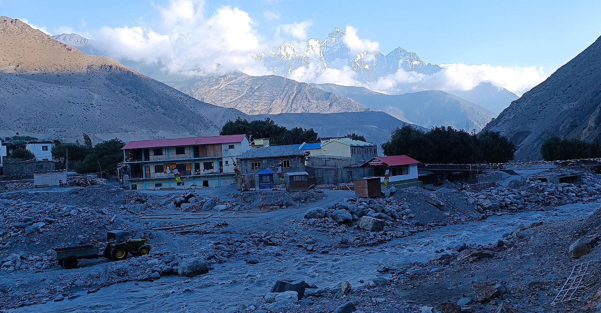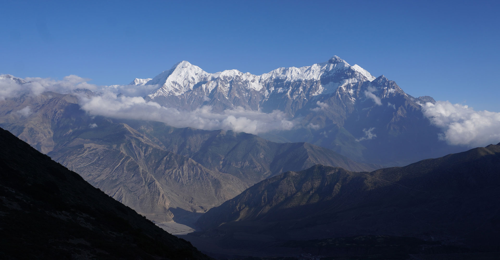 मुस्ताङको वारागुङ मुक्तिक्षेत्र—५ स्थित मुस्ताङ—डोल्पा सडकको फल्याक गाउँ माथिको डाँडाबाट सूर्यास्त हुँदै गर्दा कैद गरिएको नीलगिरि हिमाल र आसपासको भूगोल