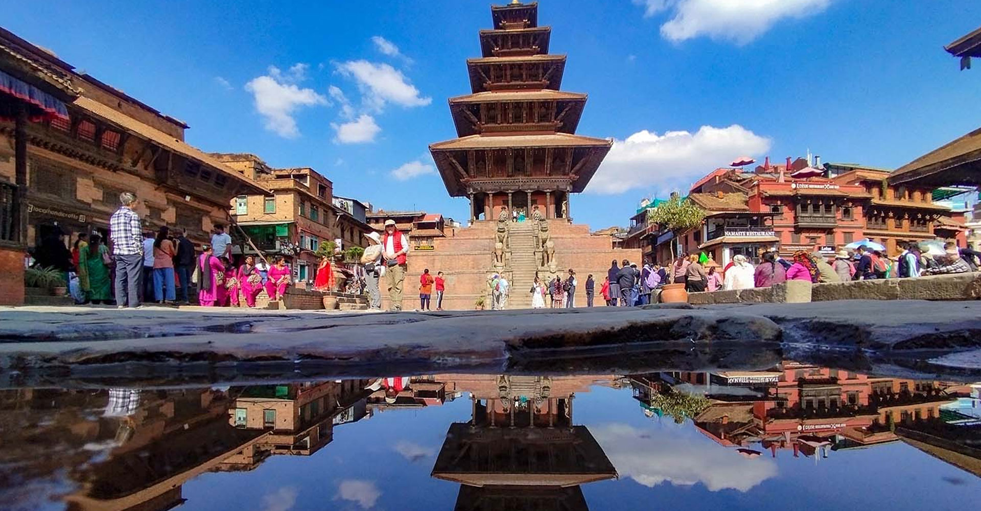 भक्तपुरको न्यातापोल मन्दिर अगाडि बनेको पानीको पोखरीमा देखिएको न्यातापोलको प्रतिबिम्ब