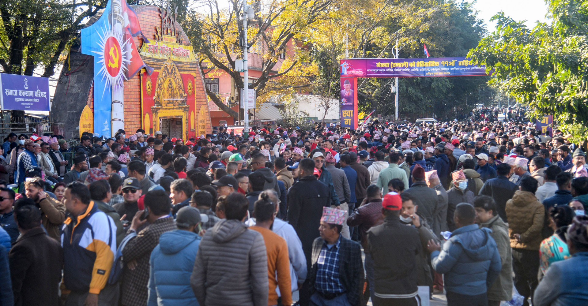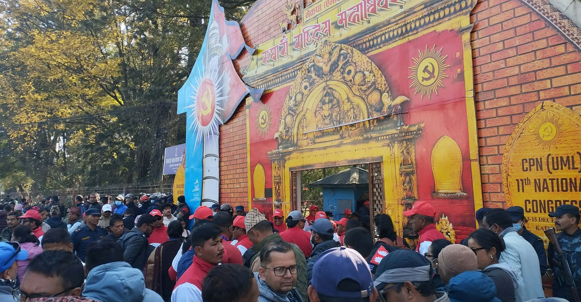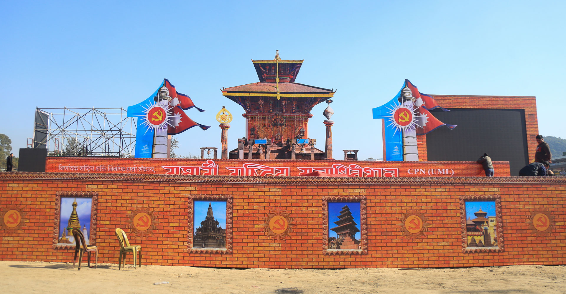 सल्लाघारीमा एमाले महाधिवेशन : मञ्चमा प्रसिद्ध चाँगुनारायण मन्दिर र अध्यक्ष केपी शर्मा ओलीको कटआउट राखिएको छ