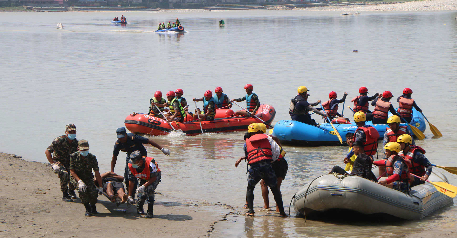 नारायणगढको नारायणी तटमा बागमती प्रदेशको आन्तरिक मामिला तथा कानुन मन्त्रालयले बिहीबार आयोजनामा गरेको विपद व्यवस्थापनका लागि संयुक्त नमुना अभ्यास कार्यक्रममा अभ्यास गर्दै सुरक्षाकर्मीहरु । संयुक्त नमुना अभ्यासमा नेपाली सेना, सशस्त्र प्रहरी बल, नेपाल प्रहरी, नेपाल रेडक्रस सोसाइटी, नेपाल स्काउटको सहभागिता रहेको थियो