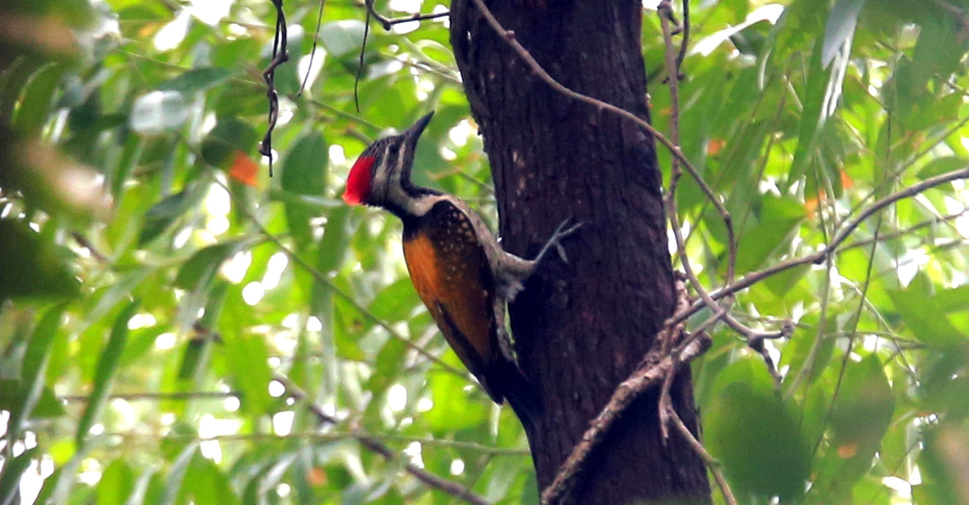 सुनसरीको इनरुवा नगरपालिका-९ मा आहाराको खोजीमा रहेको कालोढाडे लाहाँचे (ब्ल्याक-रम्पेड फ्लेमब्याक) चरा । यो चराले विशेषगरी रुखका बोक्रामुनिका साना लार्भा खाने गर्दछ