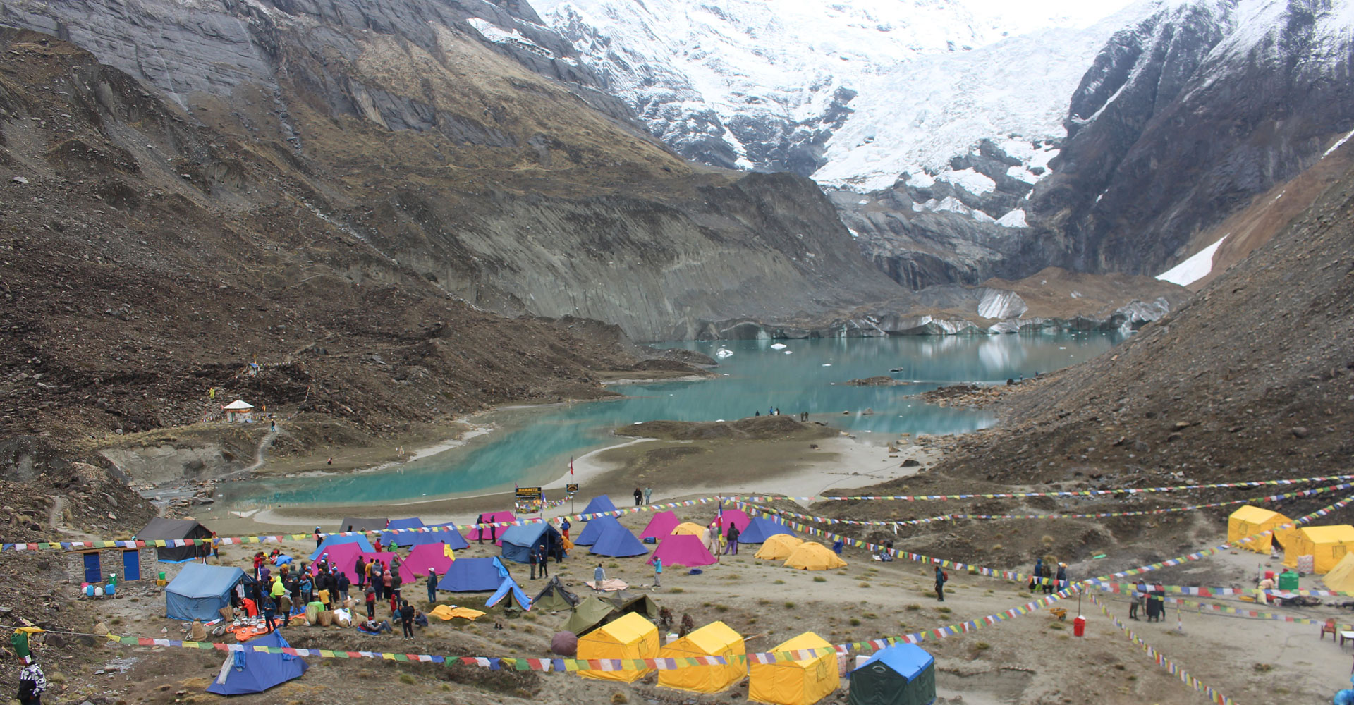 म्याग्दीको अन्नपूर्ण गाउँपालिका– ४ नारच्याङमा अवस्थित अन्नपूर्ण प्रथम हिमालको आधार शिविरमा पर्यटकलाई बसोबासका लागि राखिएका टेन्ट तथा पृष्ठभूमिमा देखिएको अन्नपूर्ण हिमाल र पञ्चकुण्ड तालको मनोरम दृष्य