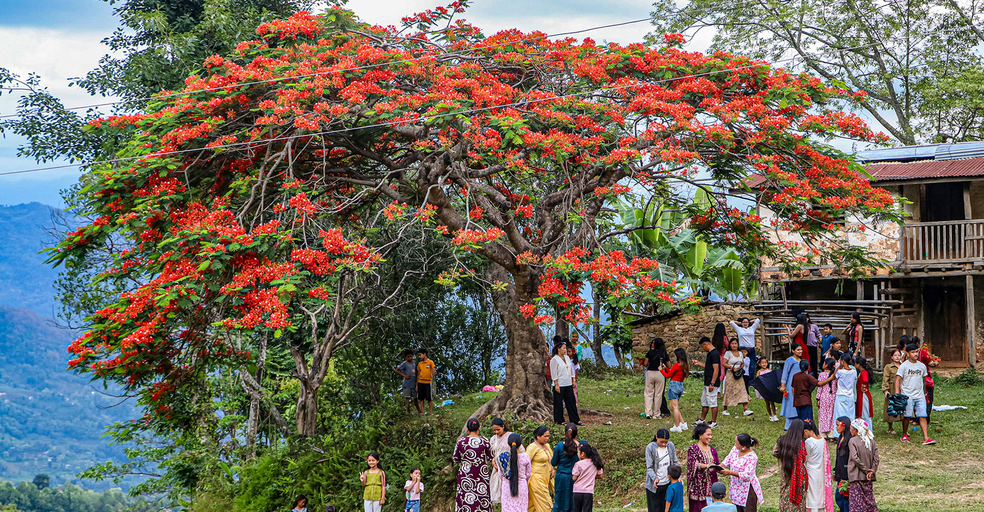 संखुवासभाको खाँदबारी नगरपालिका–८ पाठक गाउँमा रहेको गुलमोहर शिरीषको रङ्गीन फूलमा सनिबार स्थानीय पर्यटकहरु रमाउँदै। गर्मी मौसमको सुरुआतसँगै फूल फुल्न थालेपछि गाउँको प्राकृतिक सौन्दर्यले पर्यटकको आकर्षण बढाएको छ
