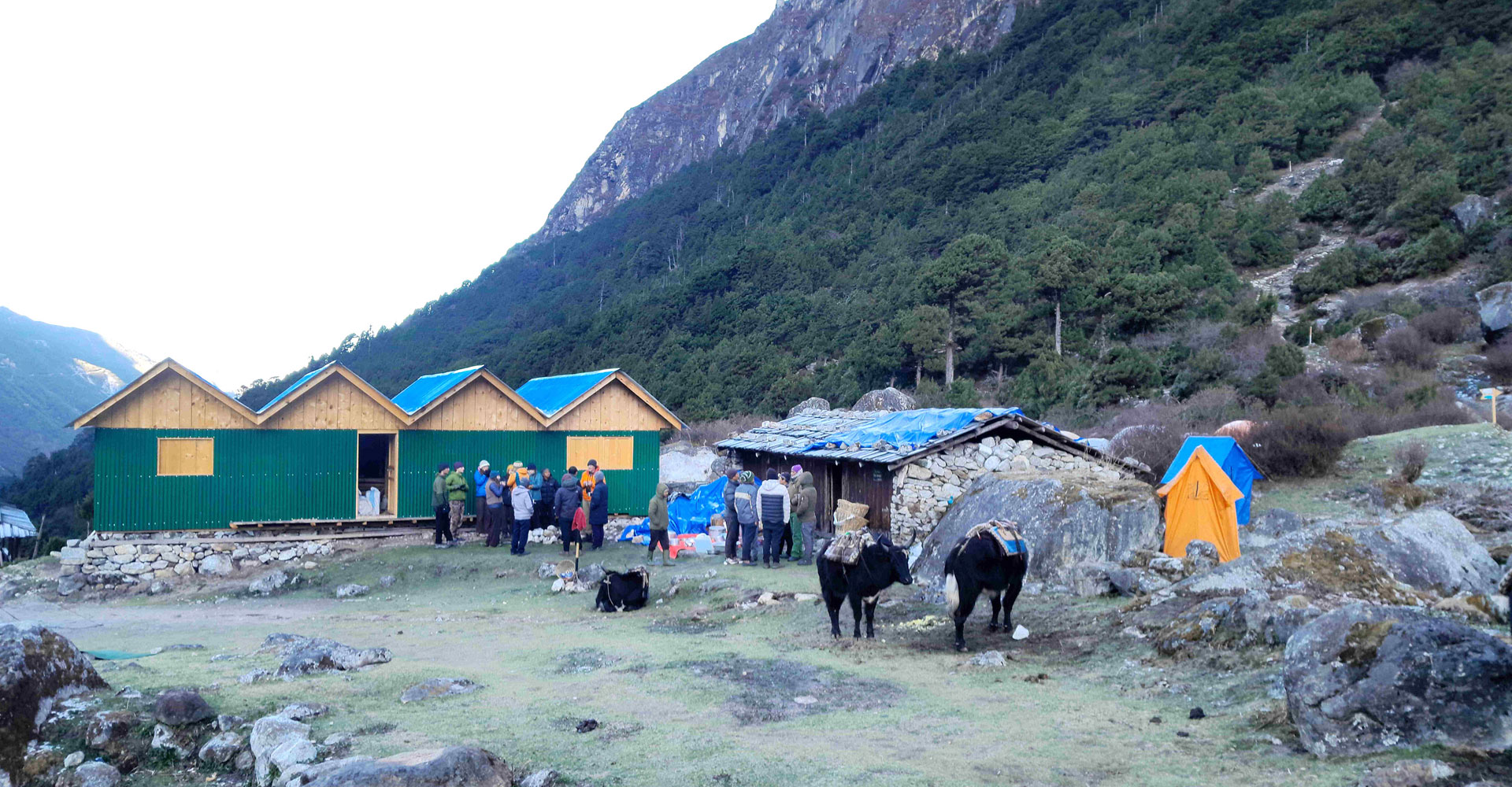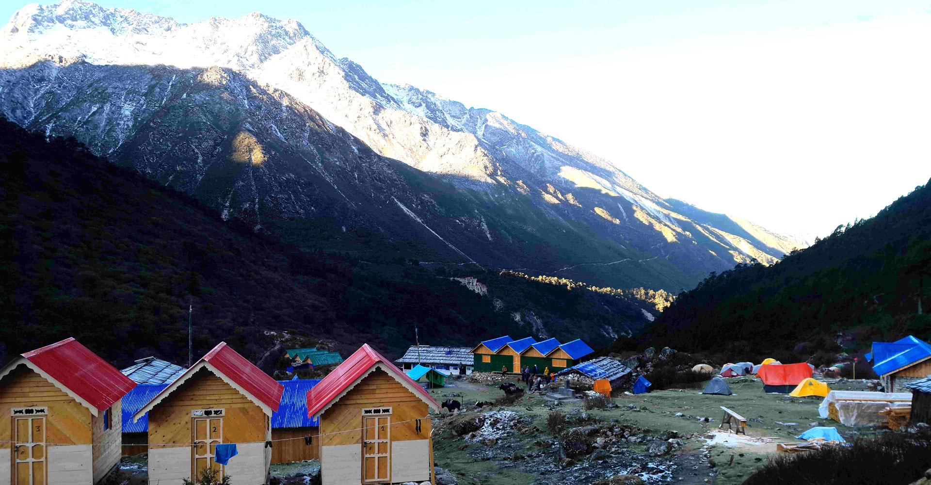 ताप्लेजुङको सिरिजङ्घा गाउँपालिका–८ चेरामस्थित पर्यटकहरु बस्न निर्माण गरिएका भवन तथा टेन्टहरु। यही मार्ग हुँदै विश्वको तेस्रो अग्लो कञ्चनजङ्घा हिमालको दक्षिणी आधार शिविर पुगिन्छ