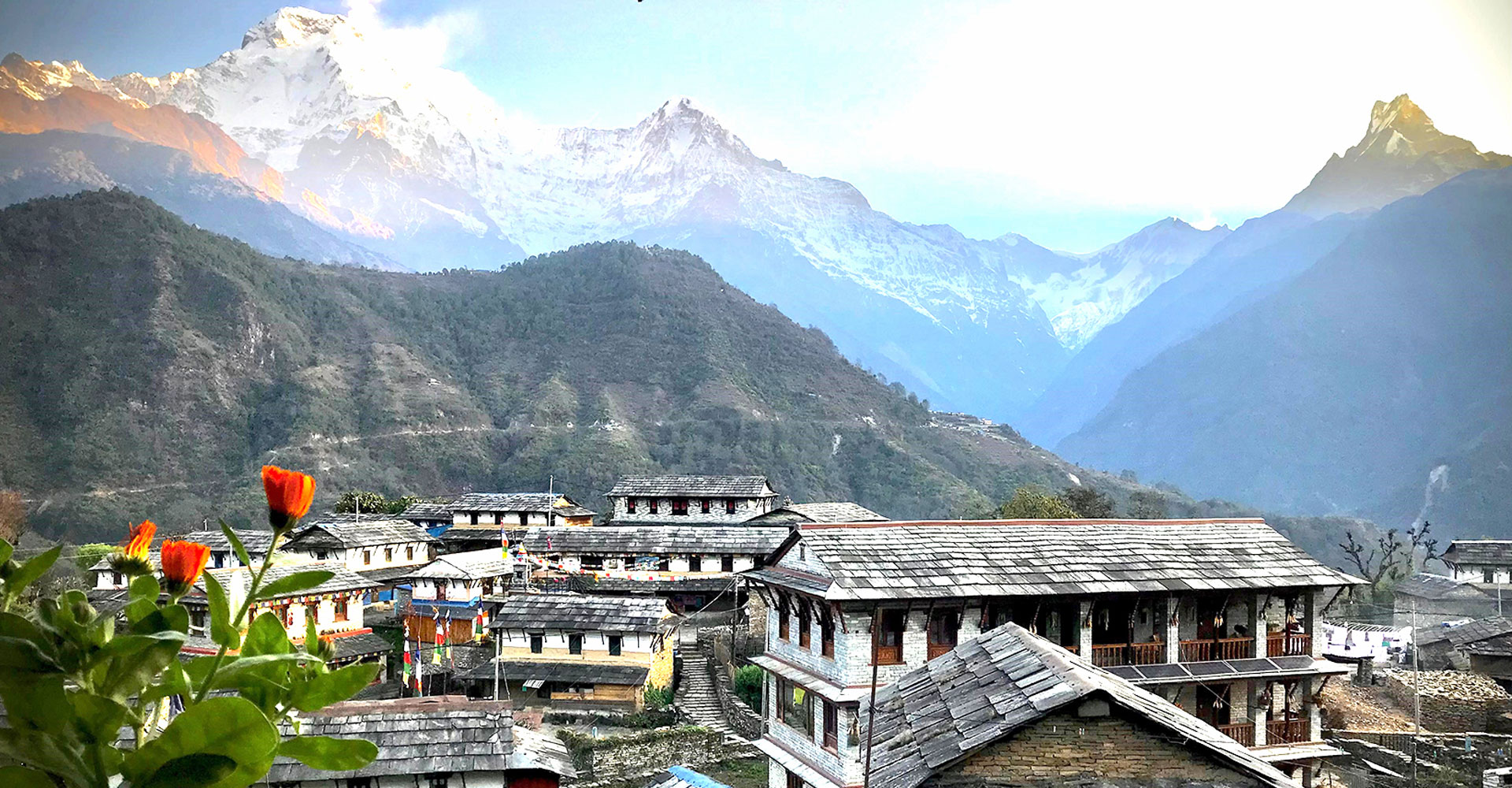 कास्कीको अन्नपूर्ण गाउँपालिकामा अस्वस्थित पर्यटकीय गाउँ घान्द्रुक र हिमाली दृश्य
