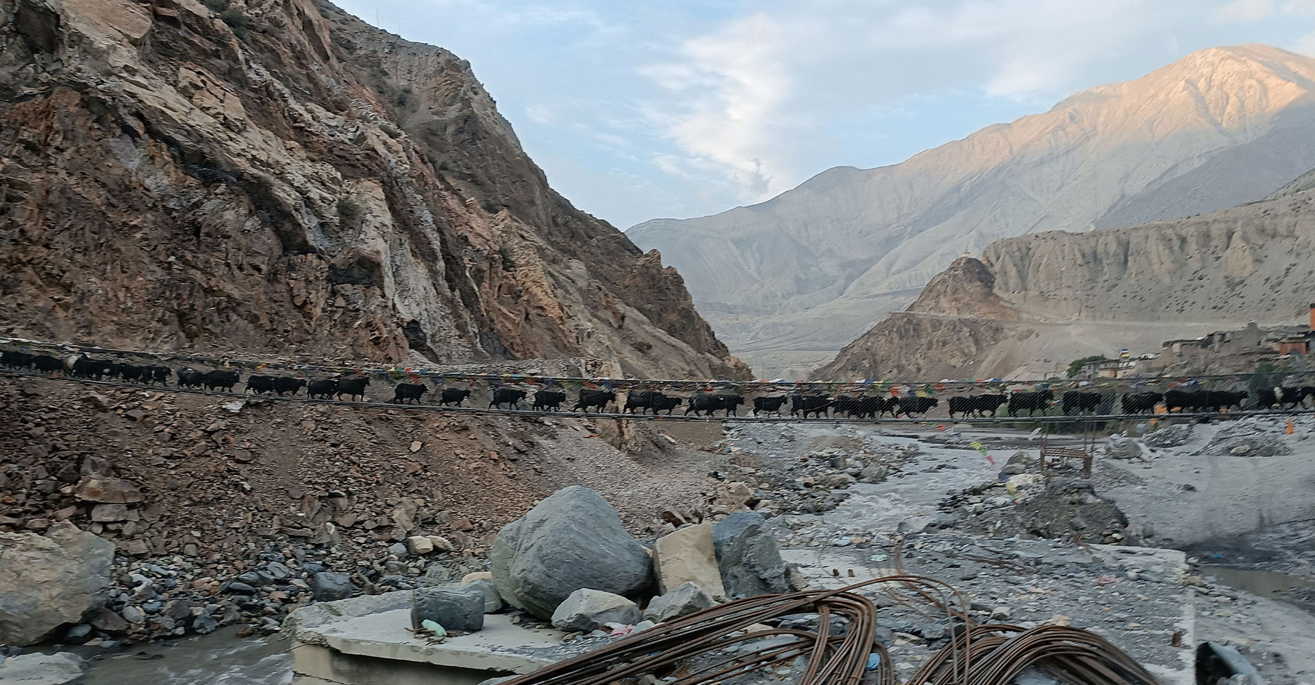 मुस्ताङको वारागुङ मुक्तिक्षेत्र गाउँपालिका-४ स्थित कागबेनीधाम नजिकै रहेको कालीगण्डकी नदीको झलुङ्गे पुल तर्दै गरेका च्याङ्ग्रा । स्थानीय कृषकले पालेका च्याङ्ग्रा दिनभर चरनक्षेत्रमा चराएर साँझपख यसरी नै घरमा ल्याउने गर्दछन