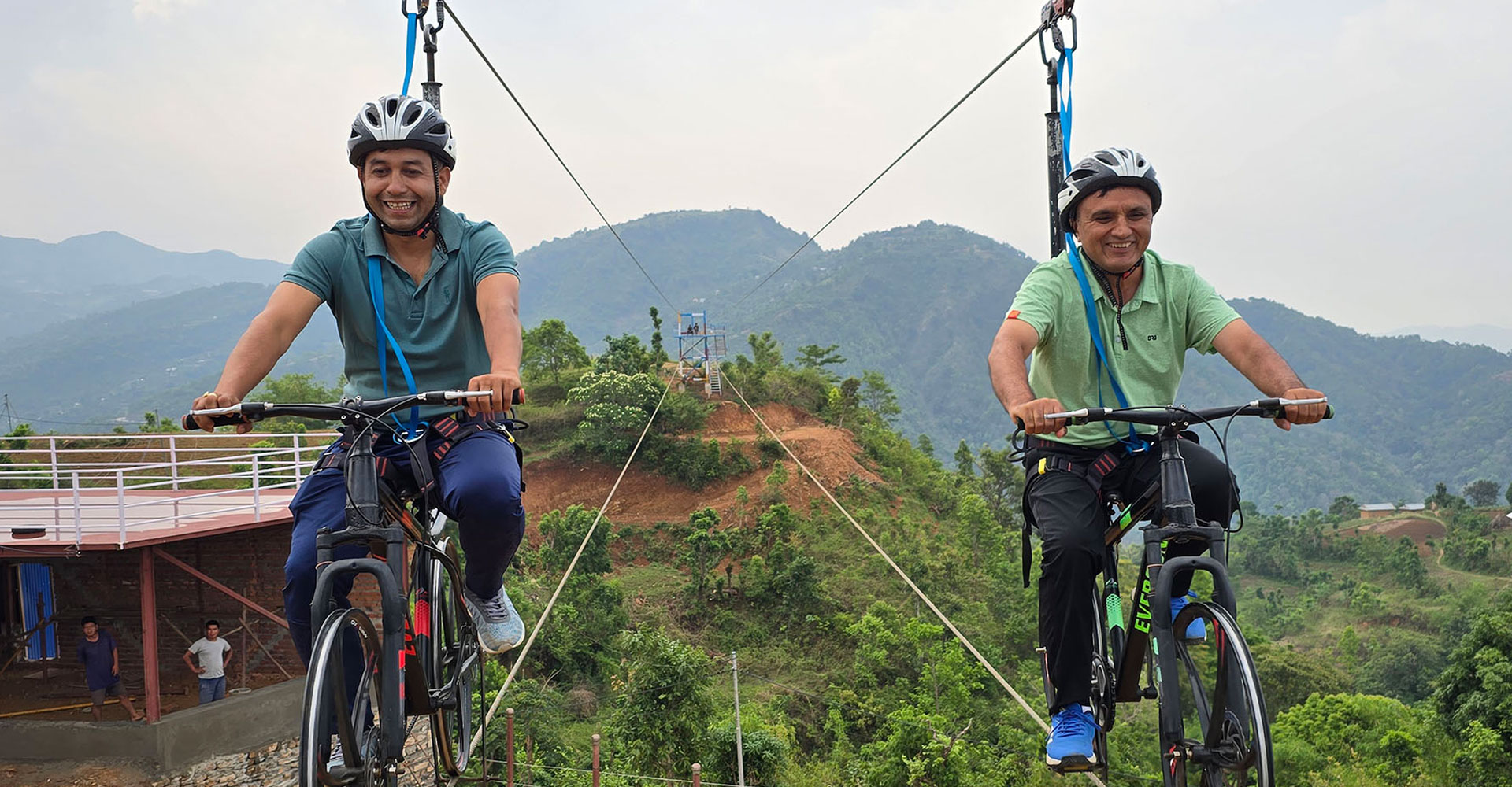 दाङको घोराही उपमहानगरपालिका–१८ स्थित घोरदौराको स्काई साईकिलिङमा रमाउँदै आन्तरिक पर्यटक
