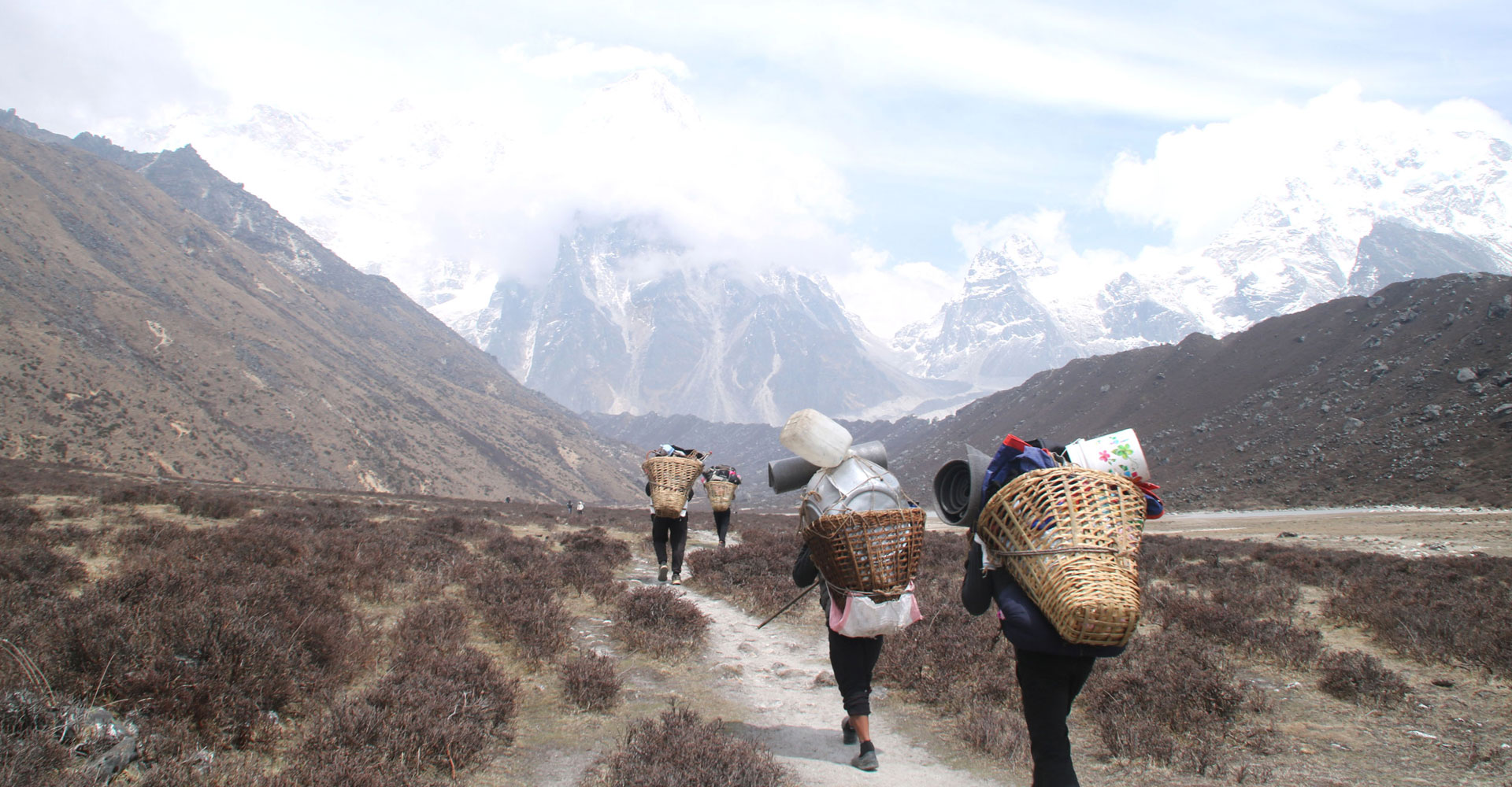 सिरिजङ्घा गाउँपालिका–८ स्थित कञ्चनजङ्घा हिमालको दक्षिण आधारशिविर क्षेत्रमा आरोहणका लागि जाने पर्यटकहरूका सामग्री बोकेर हिँड्दै गरेका भरिया