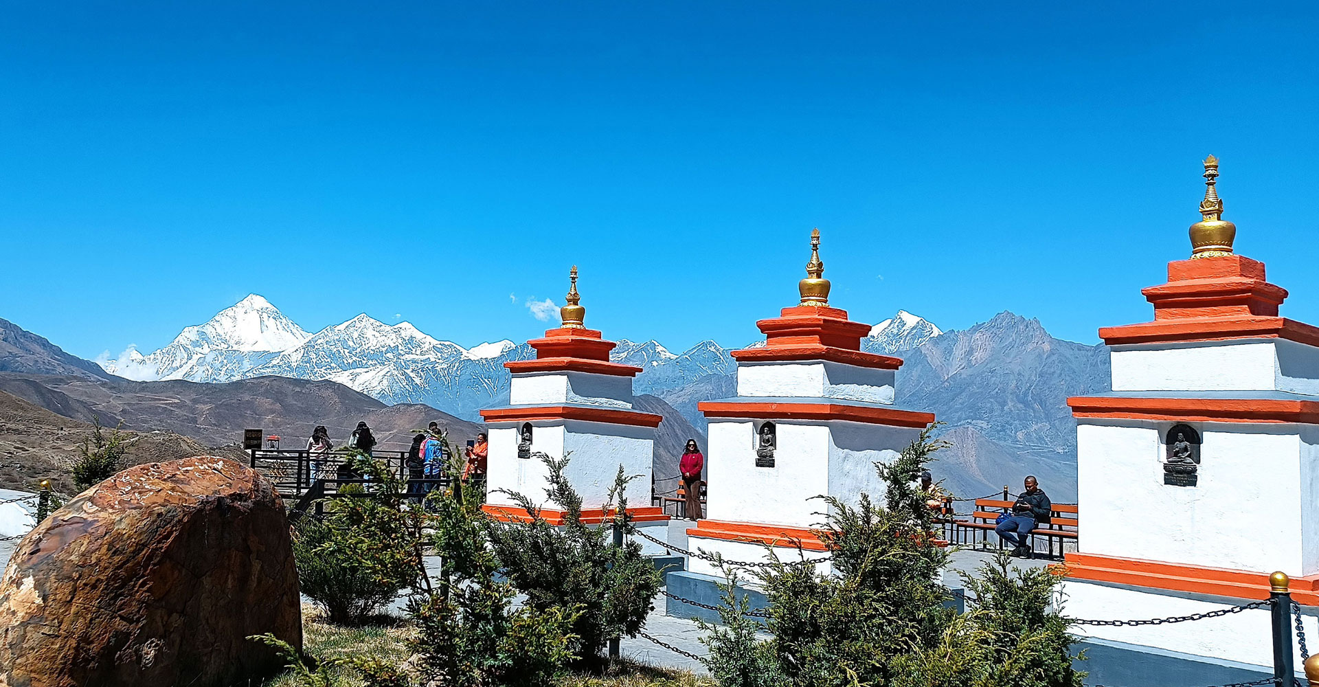 मुस्ताङको वारागुङ मुक्तिक्षेत्र गाउँपालीका-१ मुक्तिनाथ मन्दिर नजिकैबाट शुक्रबार देखिएको बौद्ध स्तुपा र बगैँचामा रमाउँदै गरेका पर्यटकहरु तथा पृष्ठभूमीमा निलगिरि हिमाल