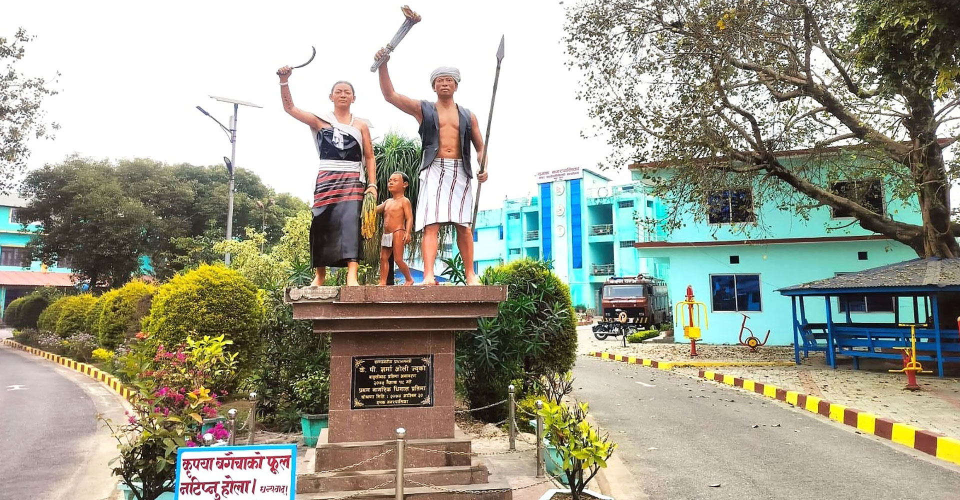 झापाको दमक नगरपालिका कार्यालयको प्रवेशद्वारमा निर्मित धिमाल जातिको प्रतिमा । अल्पसङ्ख्यक जातिका ‘धिमाल’ समुदायलाई नगरपालिकाले विसं. २०७४ असोज ३० गते प्रथम नागरिकको रुपमा घोषित गरि उनीहरुको संरक्षण र विकासमा सहयोग पुर्याउँदै आएको छ