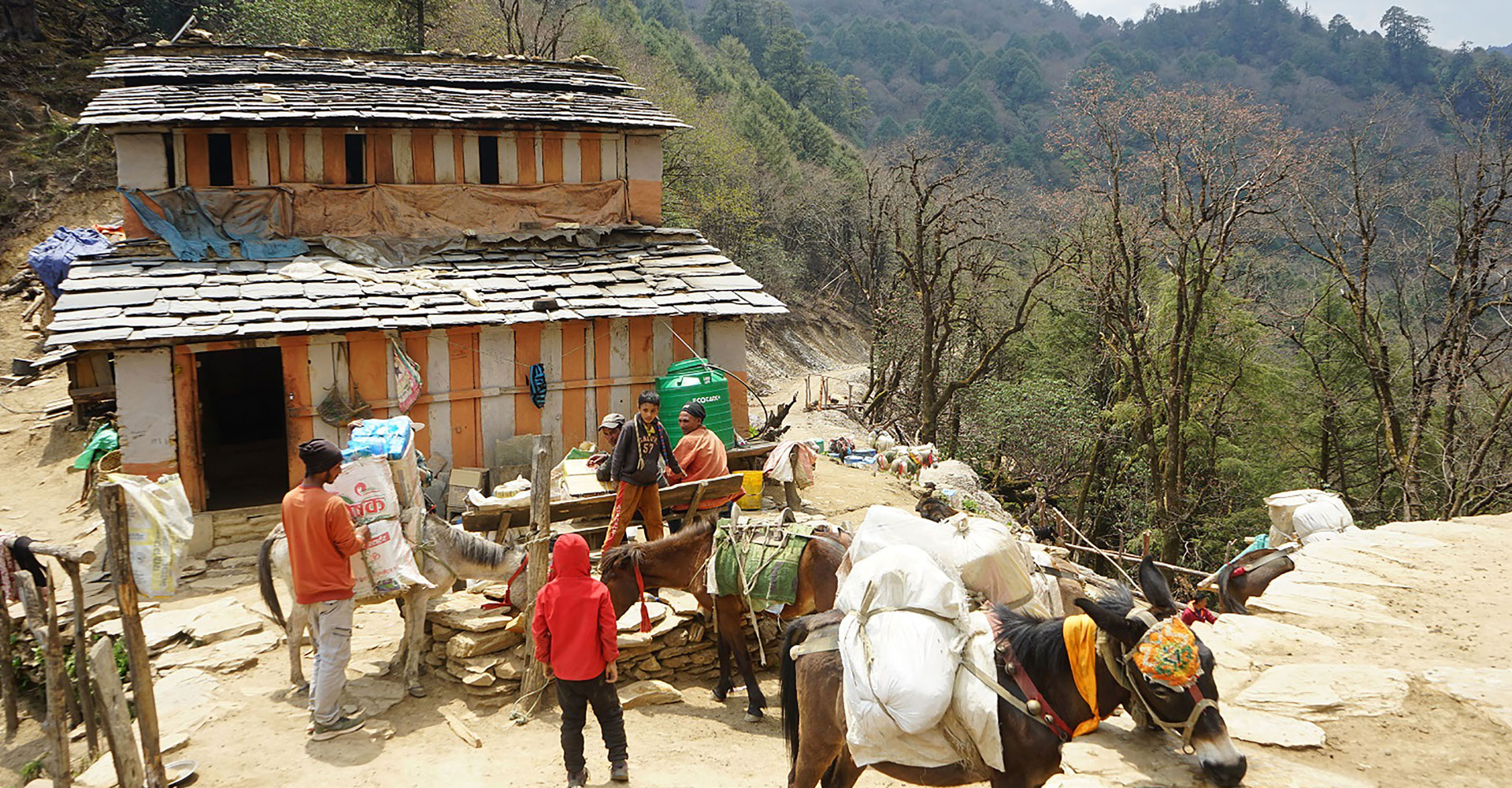 म्याग्दीको धवलागिरी गाउँपालिका–१ गुर्जामा घोडा खच्चरमाथि सामान बोकाएर ढुवानी गरिँदै । सडक यातायातको पहुँच नपुगेको गुर्जाका बासिन्दा ढुवानीका लागि खच्चर र घोडामा निर्भर छन्