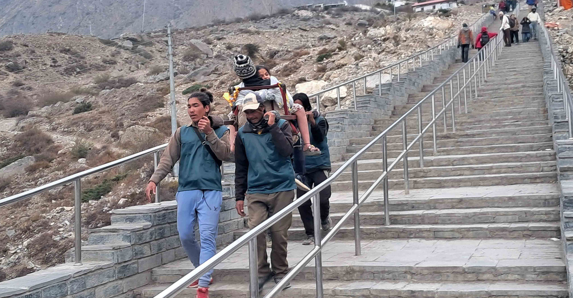 मुक्तिनाथमा मन्दिरमा पूजाअर्चनापछि भक्तजनलाई मजदुरले डोलामा बोकेर फर्किँदै । पैदल हिडन नसक्ने, शारिरीक रुपले अशक्त र ज्येष्ठ नागरिकलाई रानीपौवा बसपार्कदेखि मुक्तिनाथ मन्दिरसम्मको करिब ४५ मिनेटको दुरीमा मजदुरले सशुल्क डोलामा बोकेर लैजाने र ल्याउने सेवा दिने गर्दछन्