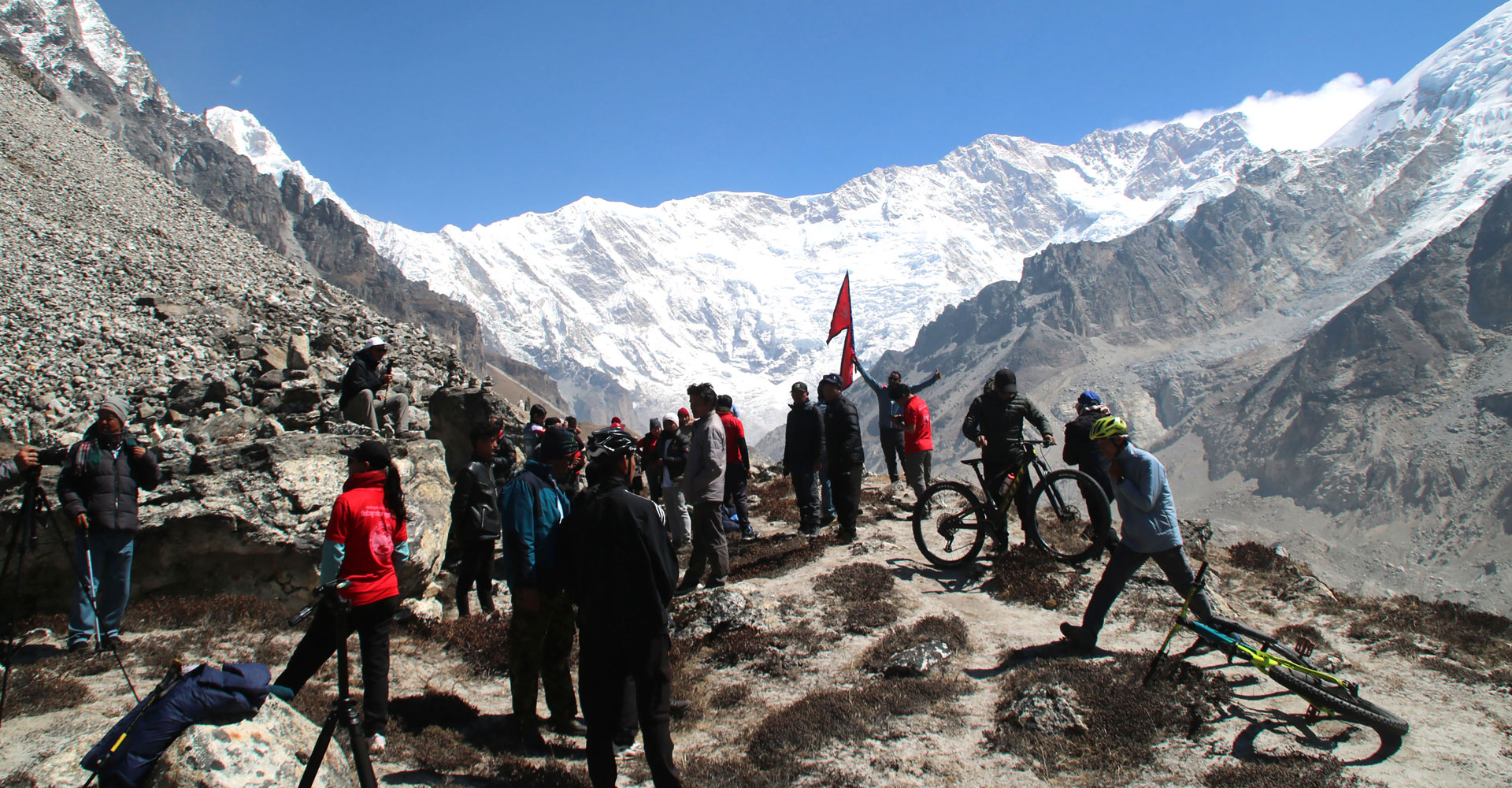 ताप्लेजुङको सिरिजङ्घा गाउँपालिका–८ याम्फुदिन अन्तर्गतको कञ्चनजङ्घा हिमालको दक्षिण आधारशिविर क्षेत्रमा रमाउँदै गरेका आन्तरिक पर्यटकहरू । ८ हाजार ५८६ मिटर उचाइ रहेको कञ्चनजङ्घा विश्वको तेस्रो अग्लो हिमाल हो