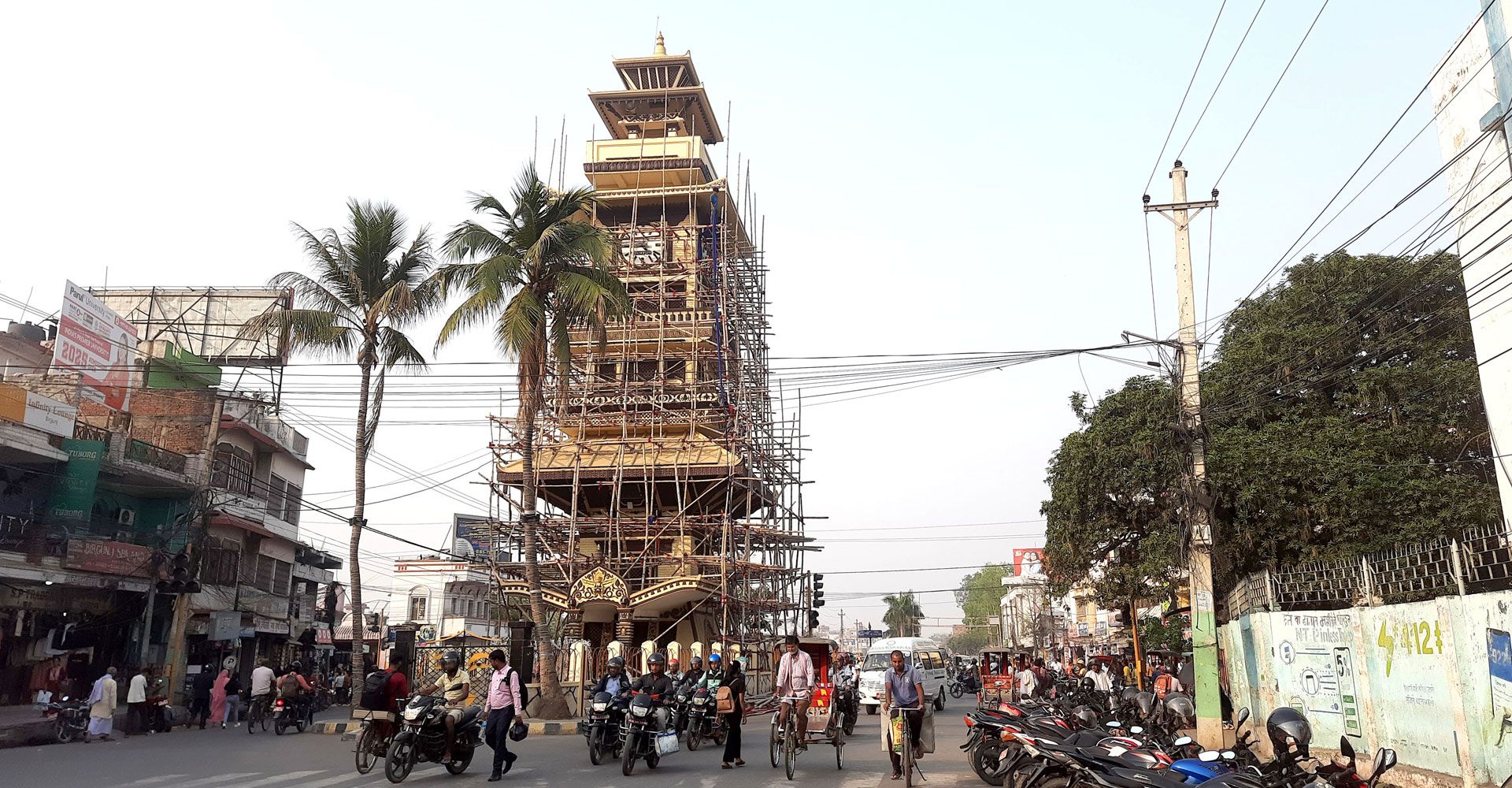 वीरगञ्जस्थित घण्टाघर मर्मतसम्भारको लागि बाधिएको खट । एक महिनाअघि घण्टाघरको केही भाग चर्किएपछि वीरगञ्ज महानगरले आवश्यक मर्मतसम्भारको काम अघि बढाएको हो