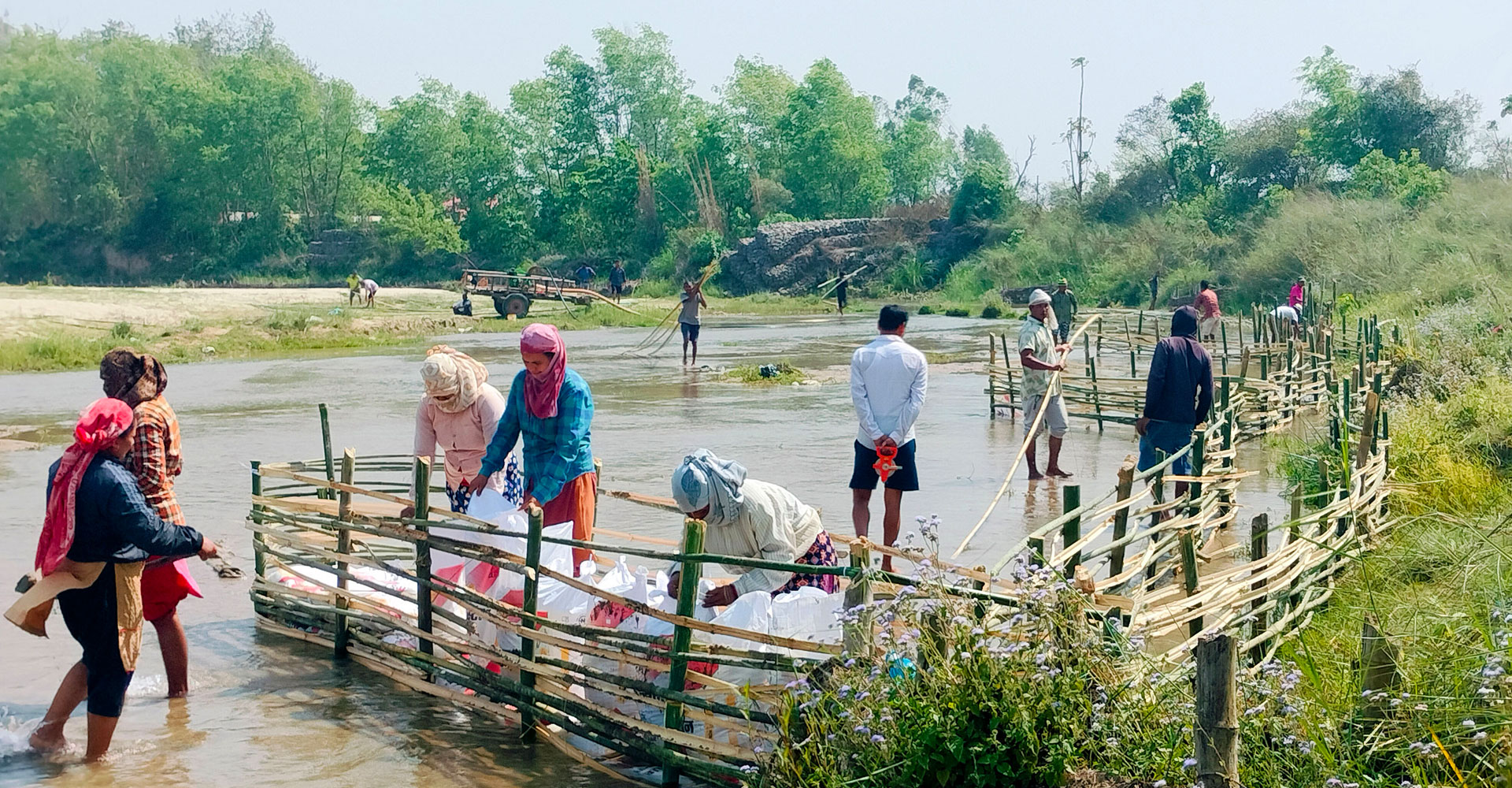 कञ्चनपुरको शुक्लाफाँटा नगरपालिका-३ स्थित सनवोरा नदीमा जैविक तटबन्ध निर्माण गर्दै स्थानीय । वडा कार्यालयको सहयोगमा स्थानीय बासिन्दाले उपभोक्ता समिति गठन गरी नदी नियन्त्रण गर्नका लागि एक सय ७५ मिटर लामो बाँसको जैविक तटबन्ध निर्माण गरिरहेका छन्