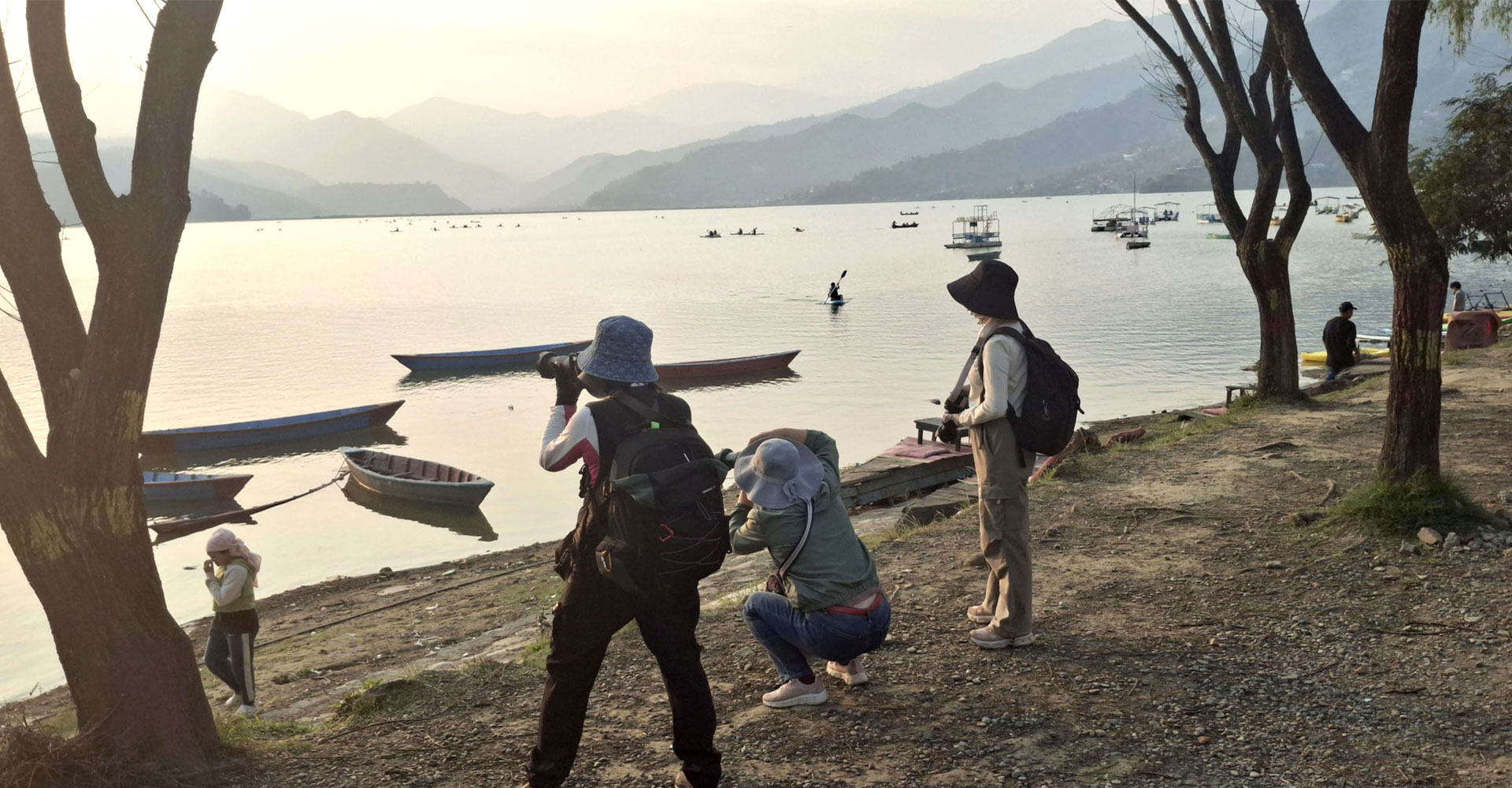 कास्कीको पर्यटकीय नगरी पोखरामा अवस्थित फेवातालको सोमबार साँझपखको दृश्य कैद गर्दै विदेशी पर्यटक