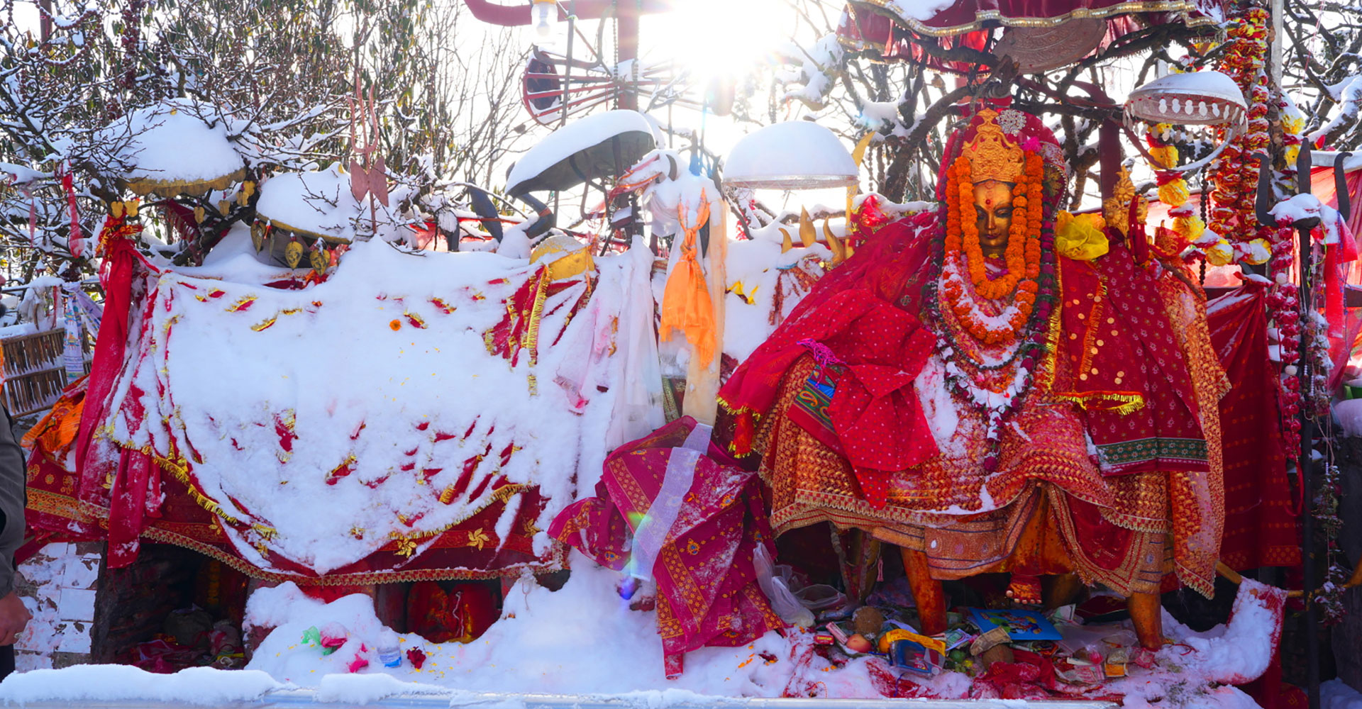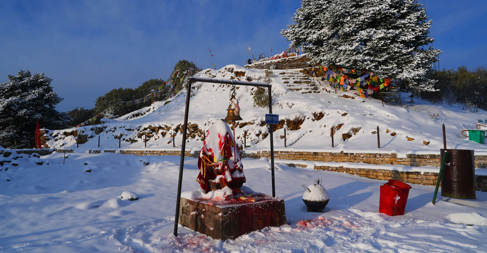 शनिबार साँझसम्म परेको हिमपातपश्चात् हिउँले ढाकिएको पाथीभरा मन्दिर परिसरको दृश्य