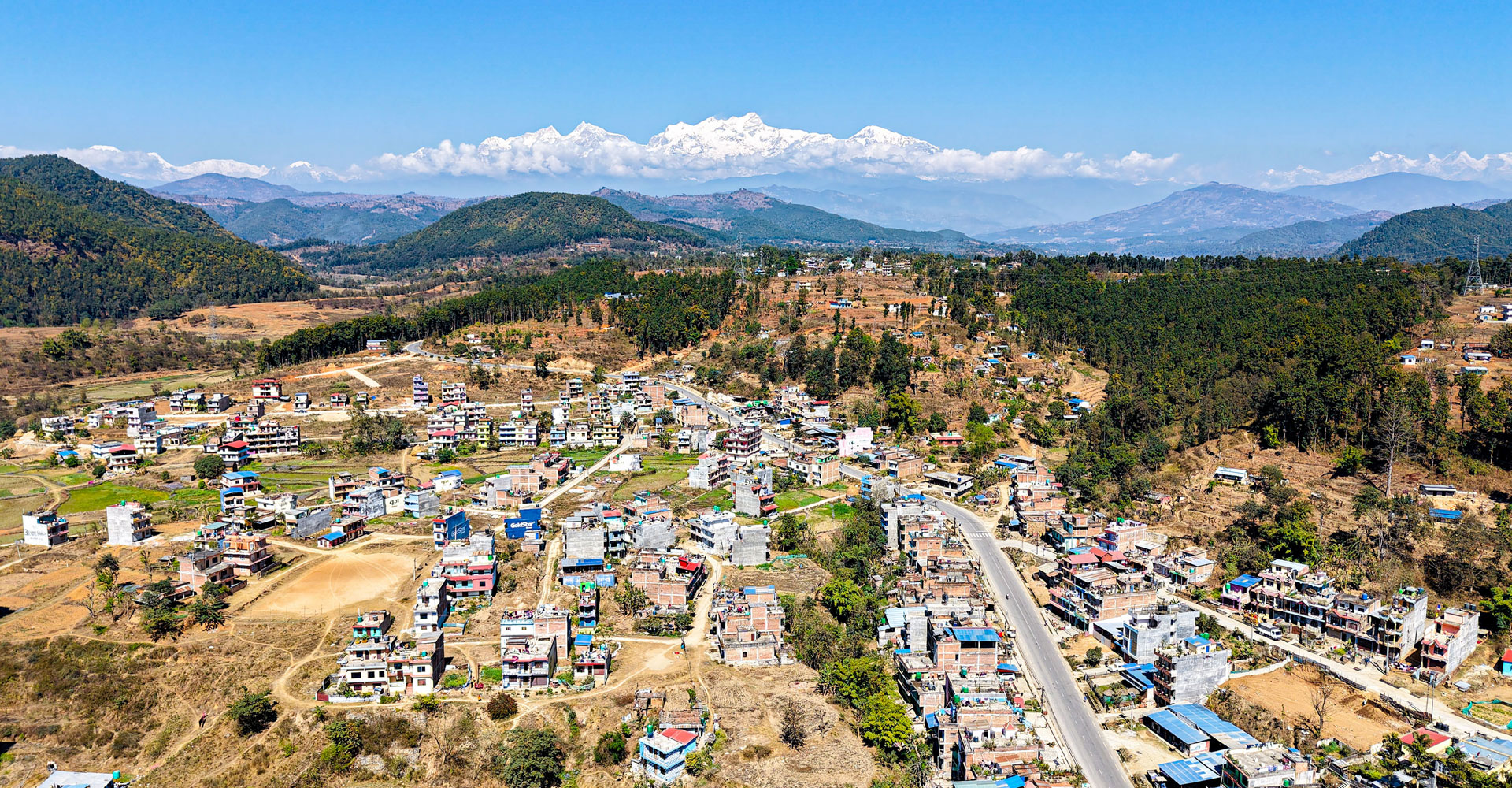मौसम खुलेपछि देखिएको तनहुँको भानु नगरपालिका–१ साजबोटे बस्ती, आसपासको क्षेत्र र पृष्ठभूमिमा लमजुङ हिमाल