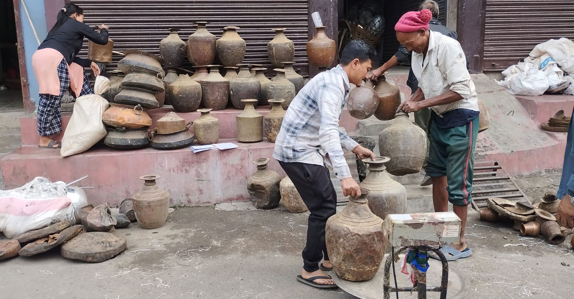 तनहुँको भिमाद नगरपालिका–६ मा पुराना तामाका भाडा जोखेर खरिद गर्दै व्यापारी । तनहुँका ऋषिङ, घिरिङ, भिमाद, नवलपुरका बुलिङटार, बौदीकाली र पाल्पाका रामपुरलगायतका ग्रामीण भेगबाट ल्याइएका ती भाडाहरु व्यापारीले पोखरा, काठमाडौँ लगेर बिक्री गर्छन्