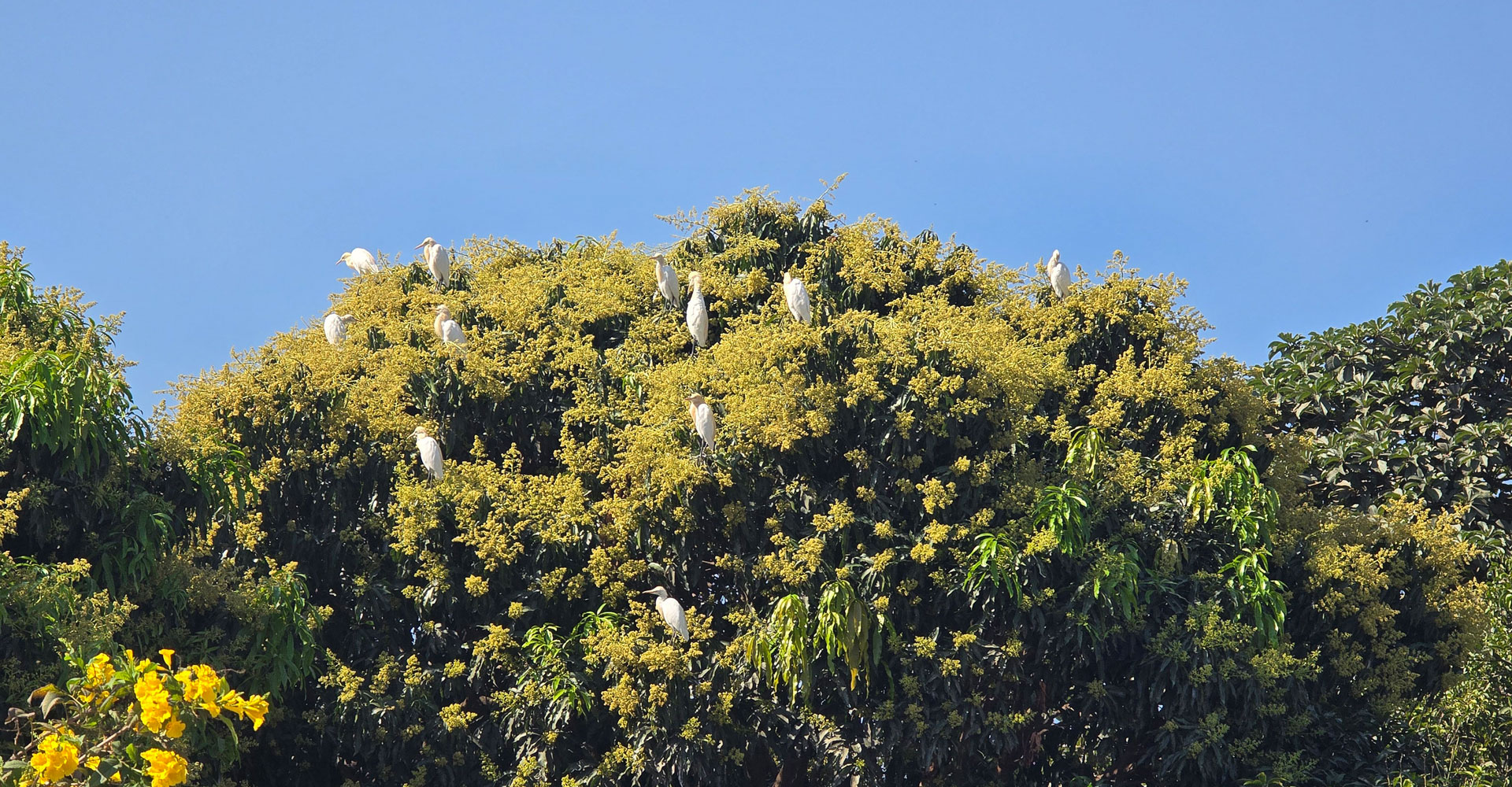 सुर्खेतको वीरेन्द्रनगर-३ मसुरिखेतमा ढकमक्क फुलेको आँपको रुखमा बसेका सेतो बकुल्लाका बथान