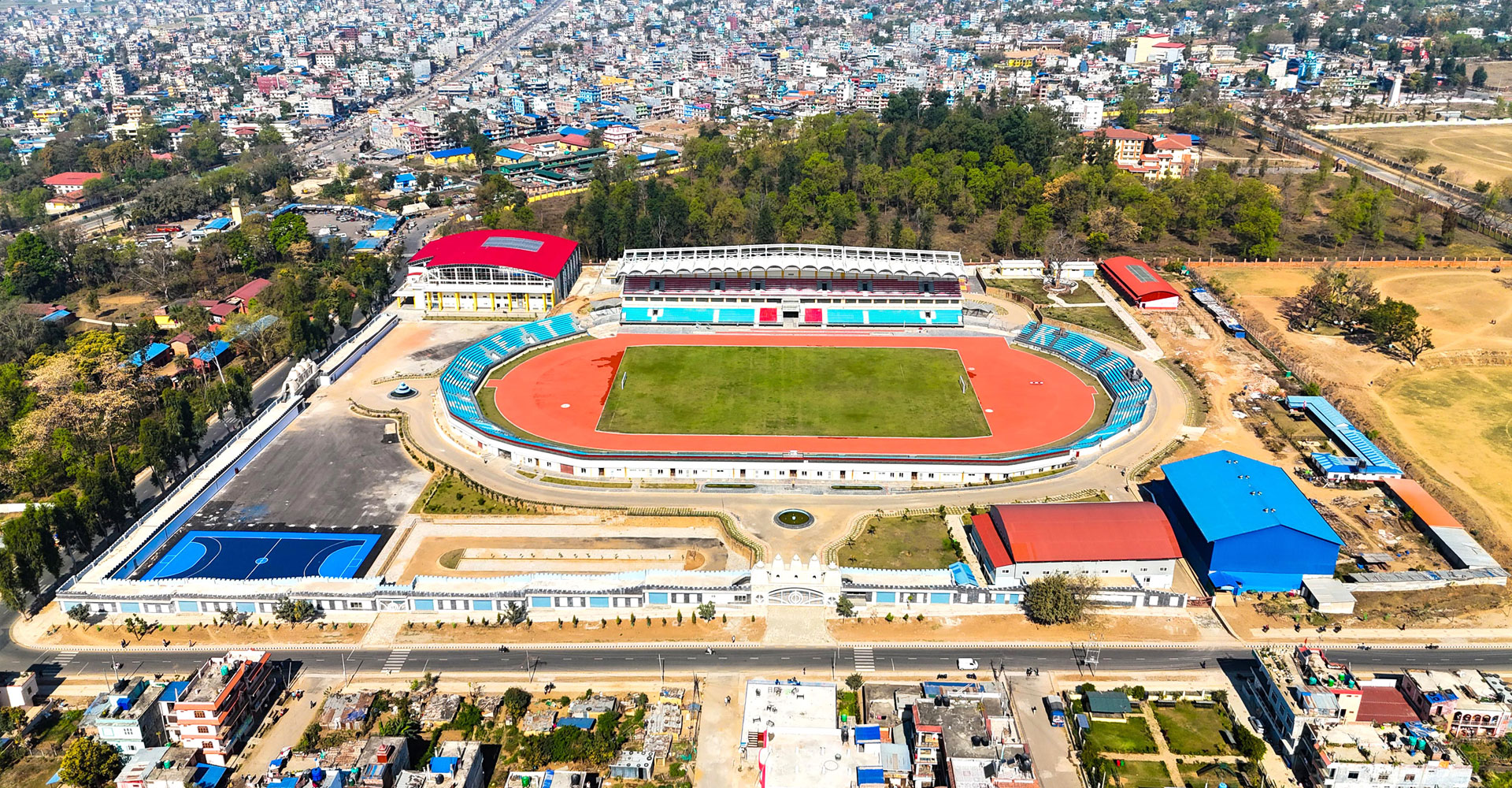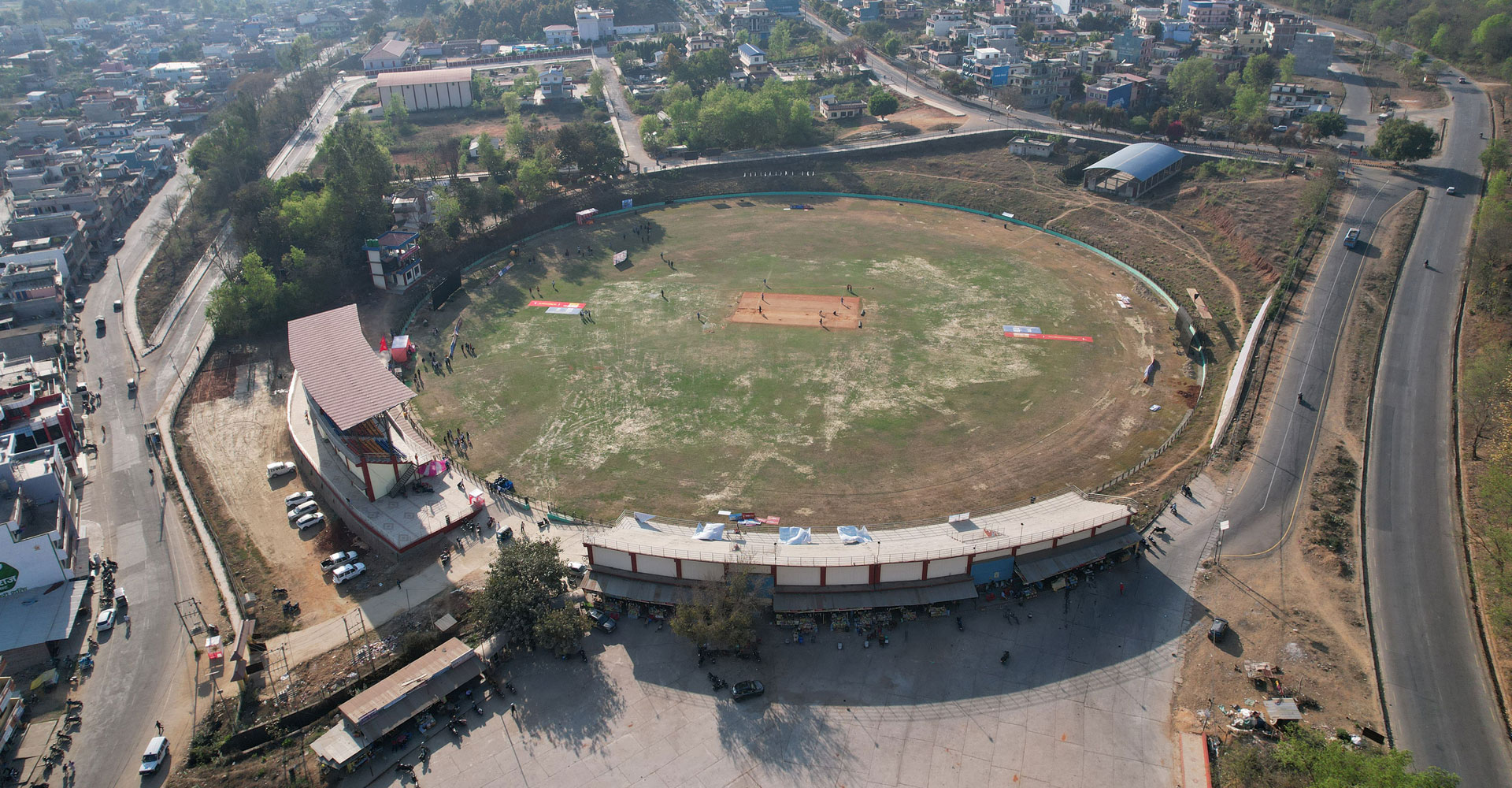 सुर्खेतको वीरेन्द्रनगरस्थित प्रदेश गौरवको आयोजना कर्णाली प्रदेश रङ्गशालाको ड्रोन क्यामराबाट कैद गरिएको दृश्य । रु एक अर्ब ४७ लाख ४७ हजार ६०० को लागतमा निर्माण भएको उक्त रङ्गशालामा आगामी २०८२ सालको जेठ ३ देखि १० गतेसम्म १०औँ राष्ट्रिय खेलकुद प्रतियोगिता हुनेछ