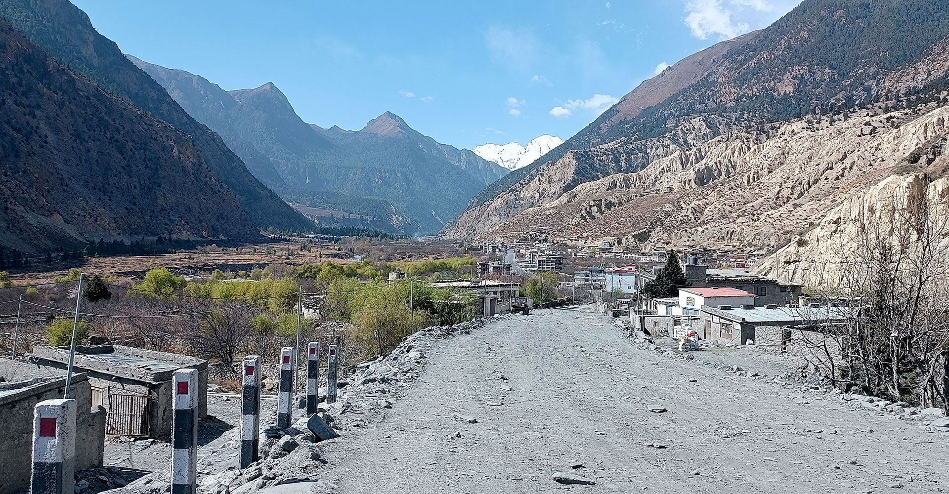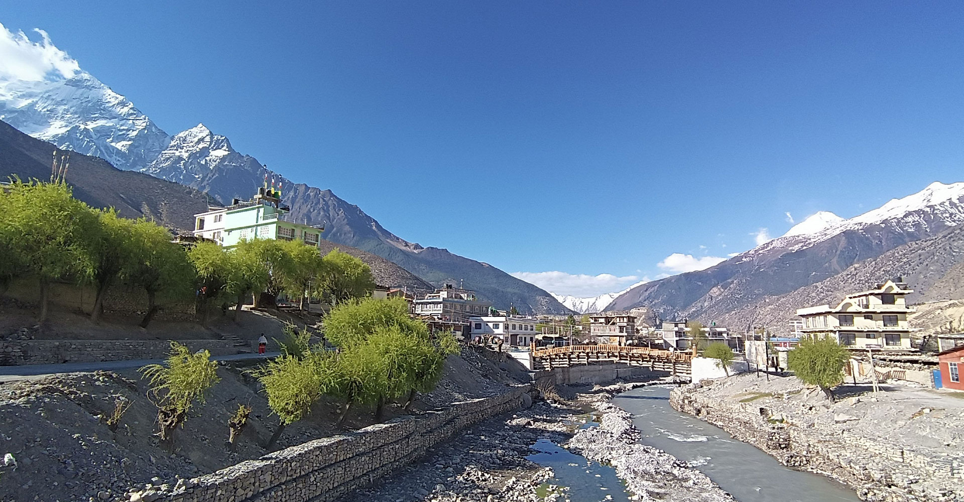 मुस्ताङको घरपझोङ गाउँपालिका–४ पक्की पुलबाट देखिएका कालीगण्डकी नदी माथि पुनःनिर्माण पछिको व्यवस्थित काठेपुलसँगै जोमसोम बजार, हिउँसहितको धौलागिरि र निलगिरि हिमाल