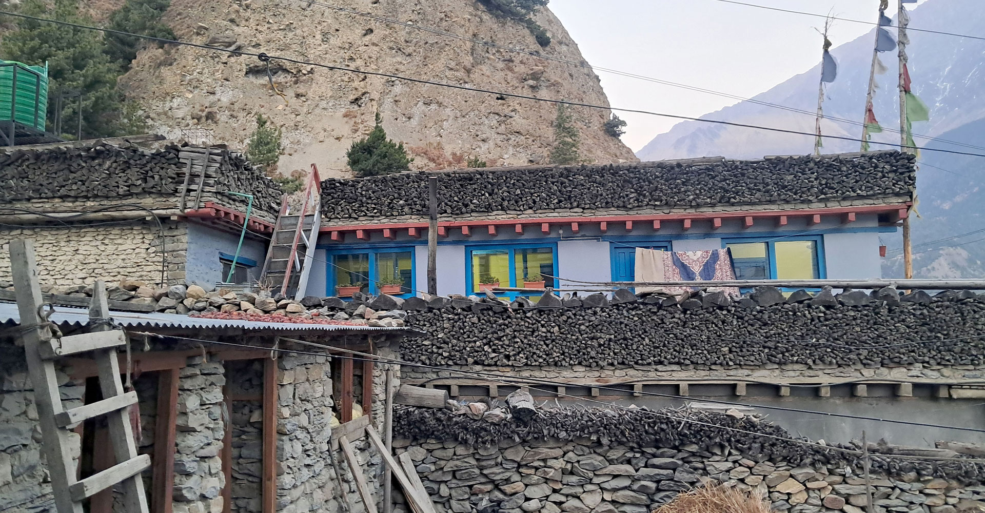 हिमाली जिल्ला मुस्ताङमा ढुङ्गा र माटोले निर्मित परम्परागत घरको छतमाथि मिलाएर राखिएको दाउरा । घरको छतमा दाउरा राख्दा घर नचुहिने उनीहरु बताउँछन्