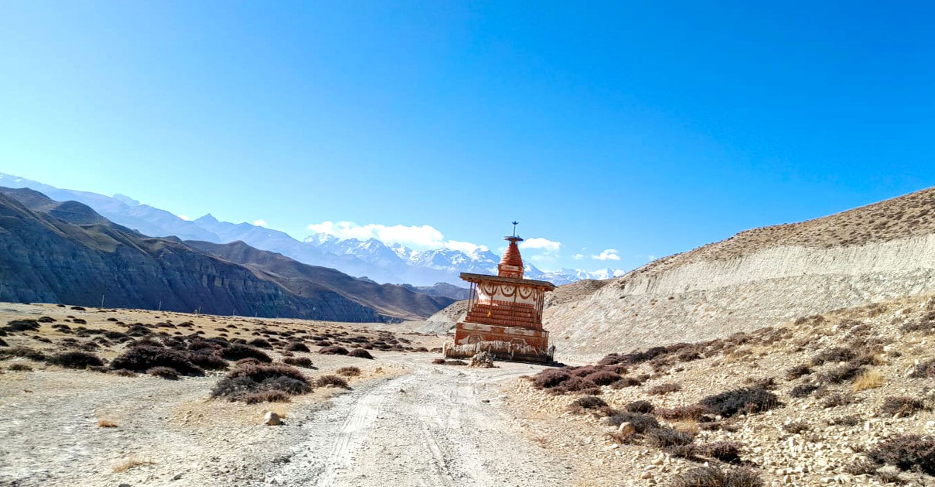 मुस्ताङको लो–घेकर दामोदरकुण्ड गाउँपालिका–१ र लोमान्थाङ गाउँपालिकाको बीचमा पर्ने सम्डुप बौद्ध स्तुपा (चैत्य) र पृष्ठभूमिमा निलगिरि हिमाल। करिब पाँच सय वर्ष पुरानो यो छ्योर्तेन (बौद्ध स्तुपा) अमेरिक हिमालयन फाउन्डेसनले निर्माण गरेको हो । कोरोला घुम्न जाँदा सडक नजिकै पर्ने यो स्तुपा तिब्बतीयन भाषामा सम भनेको मन र डुप भनेको प्राप्त हो । अर्थात् आफूले कामना गरेको चिज प्राप्त हुनु हो