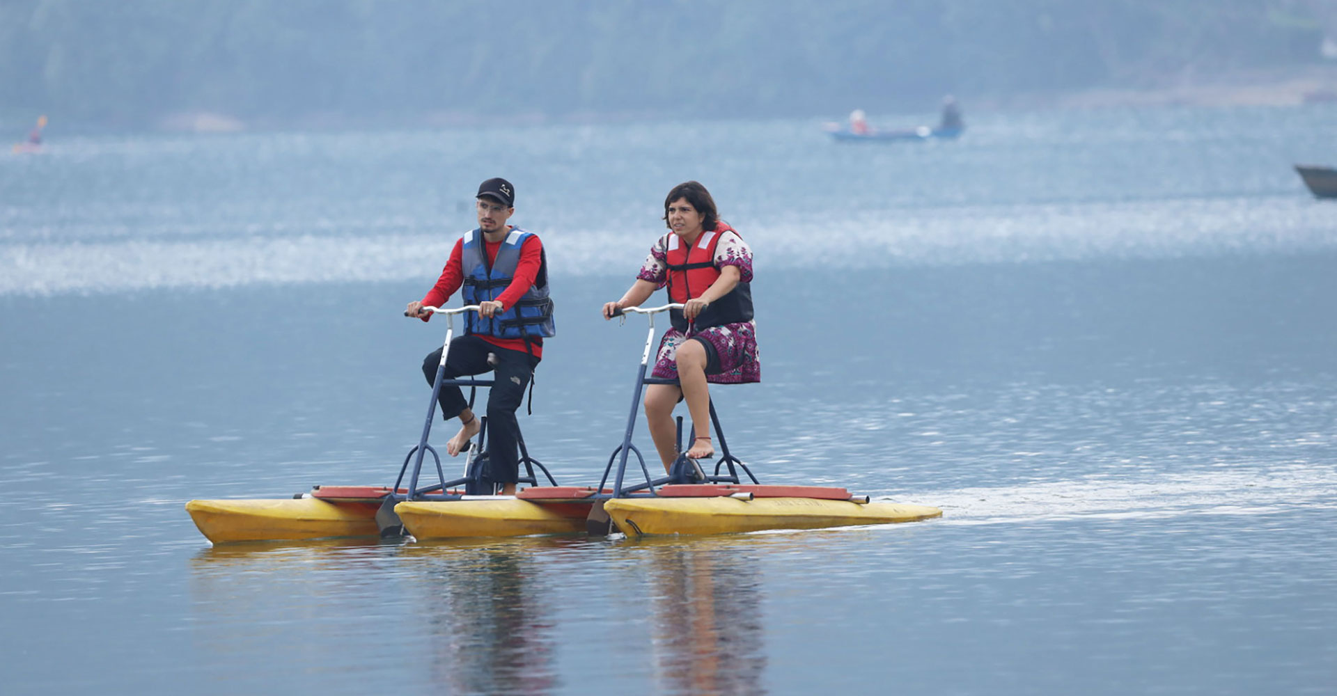पर्यटकीय राजधानी पोखराको फेवातालमा बुधबार साइकल बोर्डमा सयर गर्दै पर्यटक