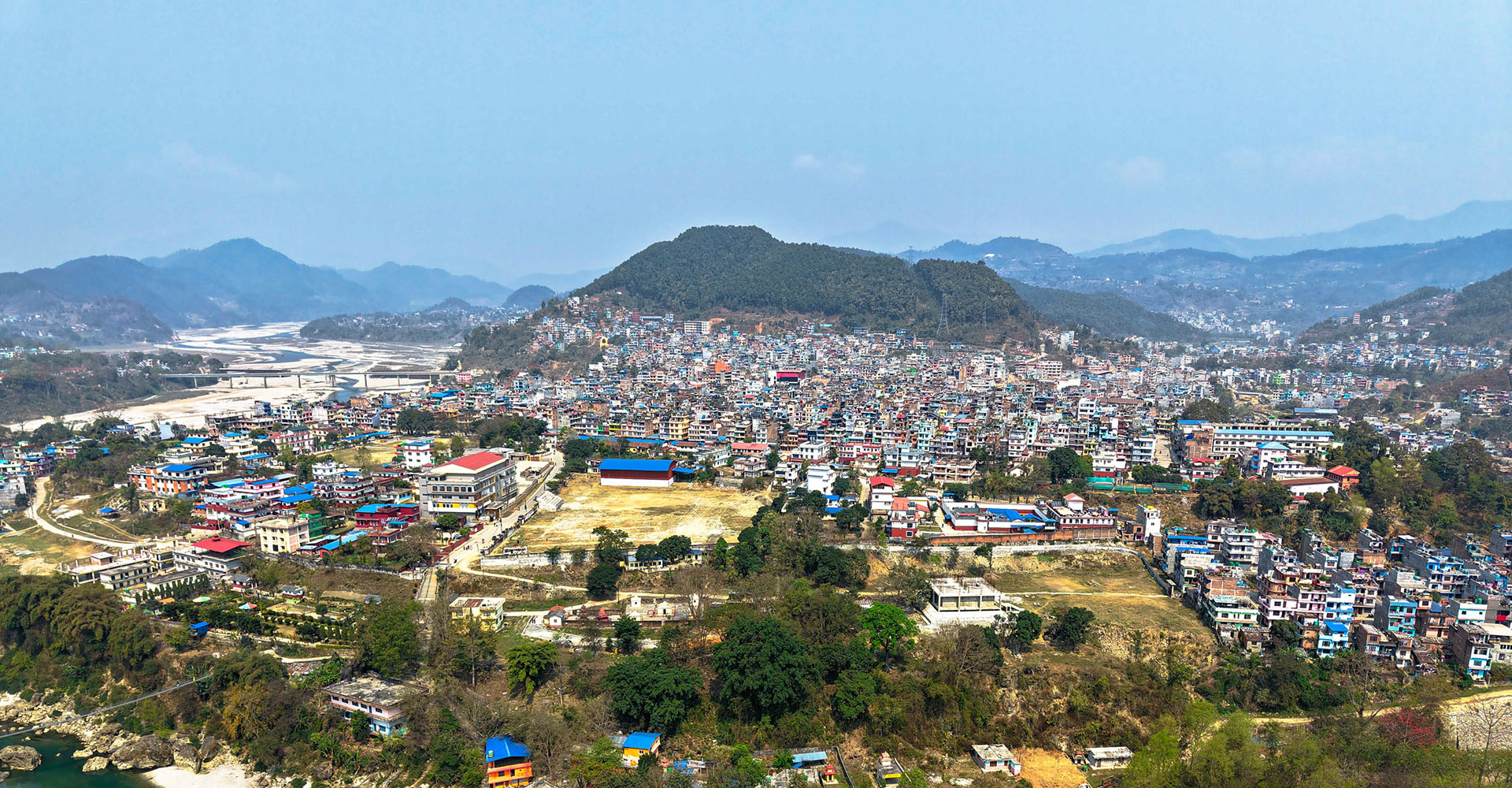 तनहुँको सदरमुकाम दमौली बजारसहित मादी नदी र आसपासको ड्रोनबाट खिचिएको दृश्य