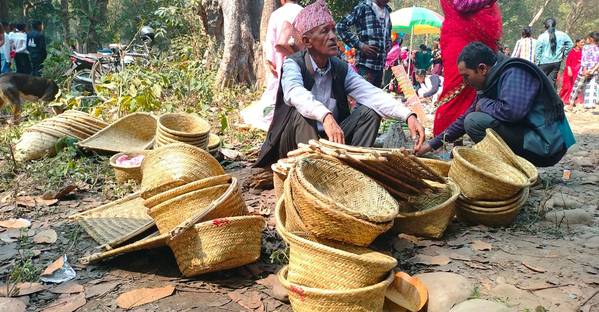 शुक्लाफाँटा नगरपालिका– ८ चुरे फेदीको धार्मिक पर्यटकीयस्थल मुडाकामा लागेको मेलामा निगालोबाट बनेका नाङलो, टोकरीलगायनका परम्परागत सीपको प्रयोग गरी घरमै बुनेका सामग्री बेच्न बसेका स्थानीय बासिन्दा । मेलामा किसानले परम्परागत सीपमा आधारित समानदेखि खेतबारीमा उत्पादन गरेका कृषिउपज बिक्रीका लागि लैजाने गरेका छन्