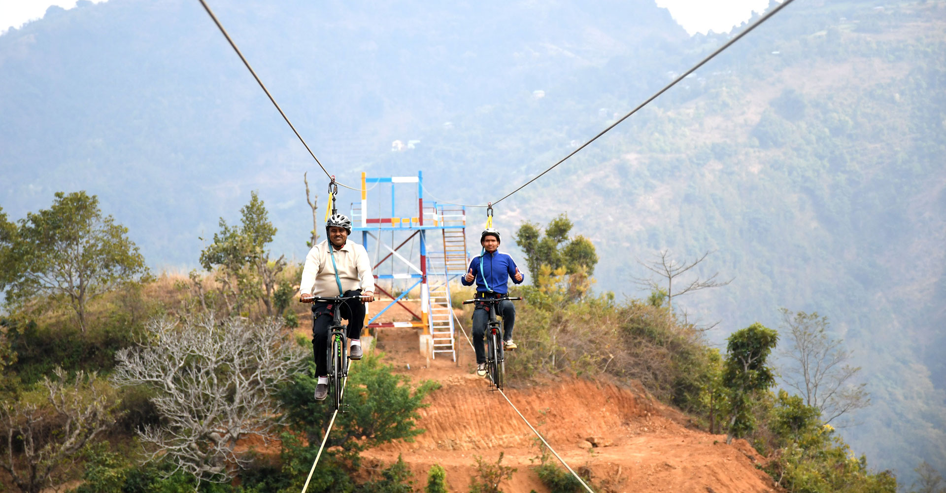 दाङको घोराही उपमहानगरपालिका–१८ स्थित पर्यटकीयस्थल घोरदौरामा सञ्चालनमा आएको घोरदौरा जीपलाइन एन्ड एडभेन्चर रिसोर्टमा स्काई साइकिलिङमा रमाउँदै आन्तरिक पर्यटक । रिसोर्टमा स्काइ साइकिलिङसँगै जीप लाइन पनि सञ्चालनमा छ