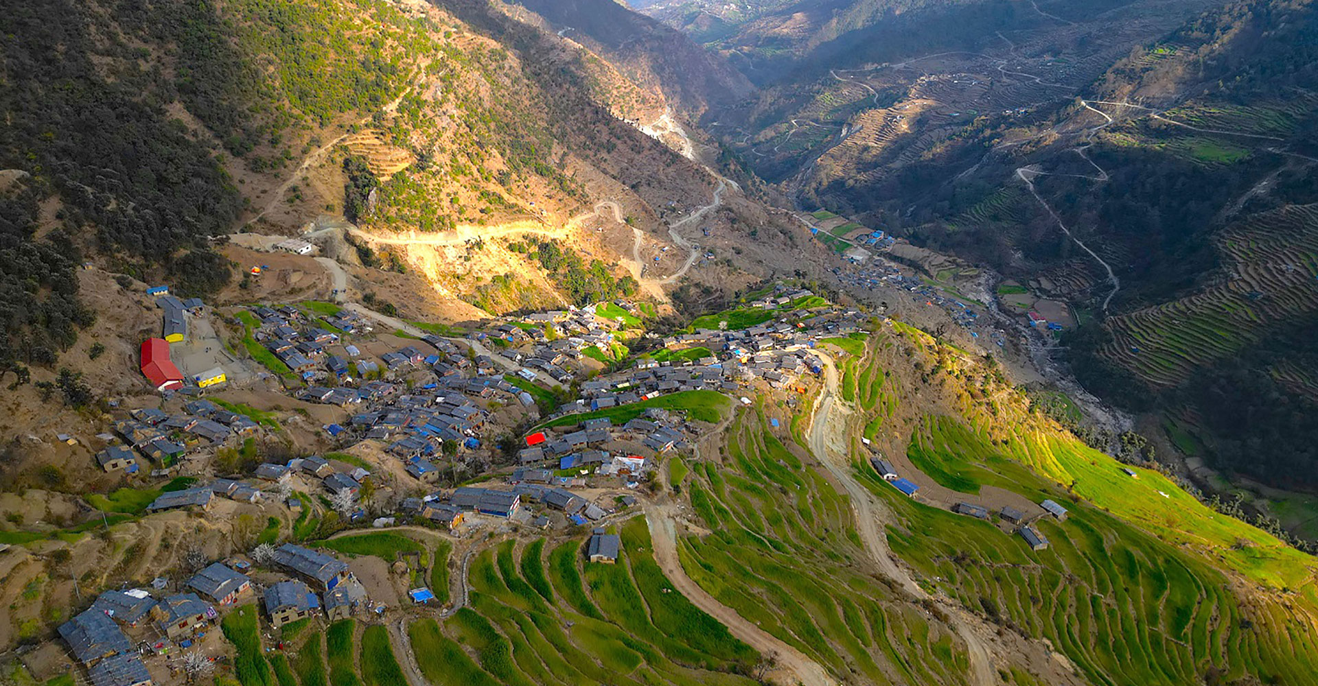 म्याग्दीको धवलागिरी गाउँपालिका–२ मा पर्ने लुलाङ गाउँका ढुङ्गे घर र वरपरको पाखामा गरिएको गहुँ खेती । लुलाङ म्याग्दीको सबैभन्दा ठूलो दलित समुदायको बसोबास भएको गाउँ हो