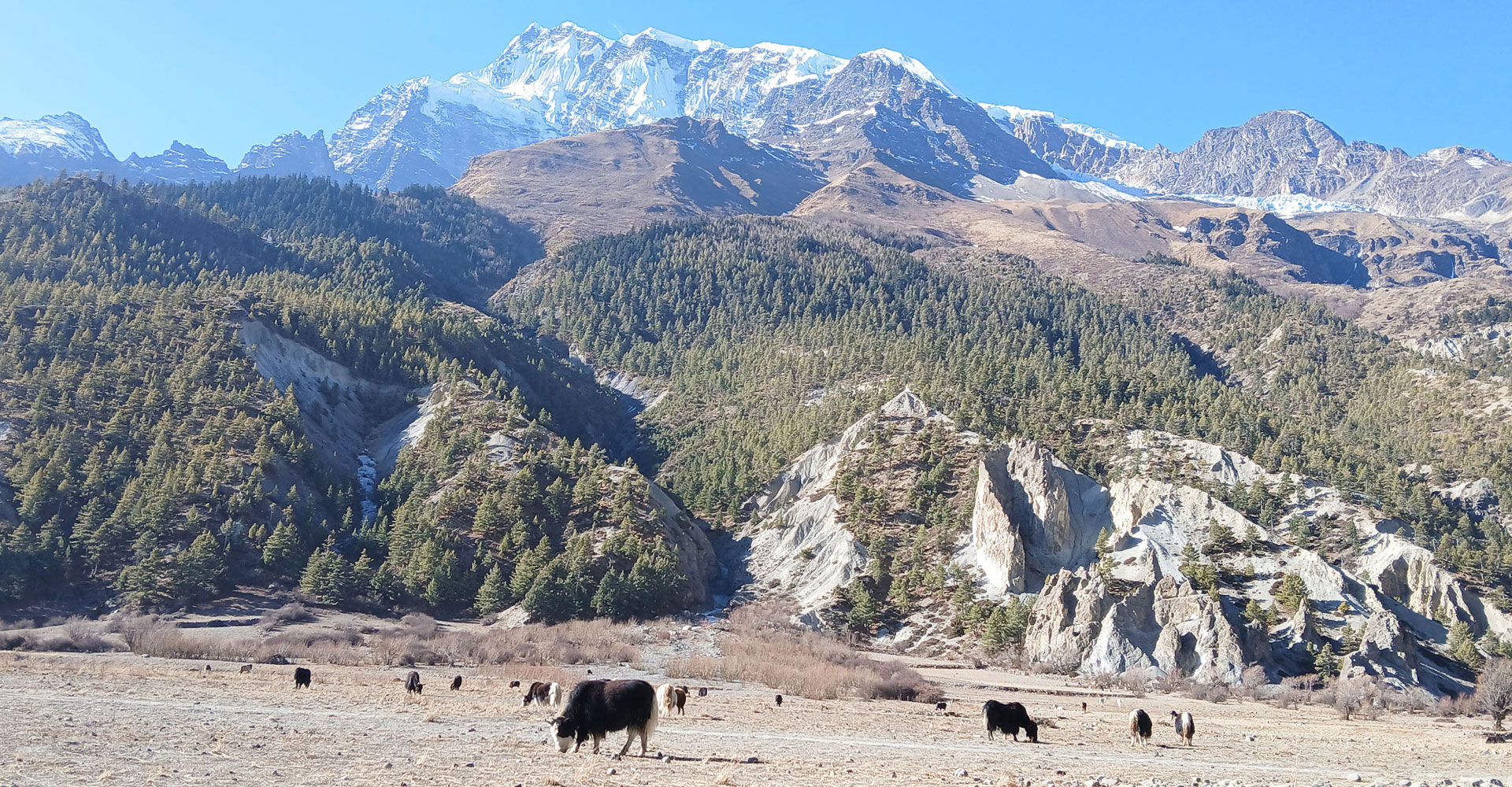मनाङ ङिस्याङ गाउँपालिका–५ मा अवस्थित चौरीखर्कमा चरिरहेका याकचौरी र पृष्ठभूमिमा अन्नपूर्ण दोस्रो हिमाल । जाडोमा तल झारिएका याकचौरी गर्मीयाममा यसै हिमालको फेदिमा लैजाने गरिन्छ