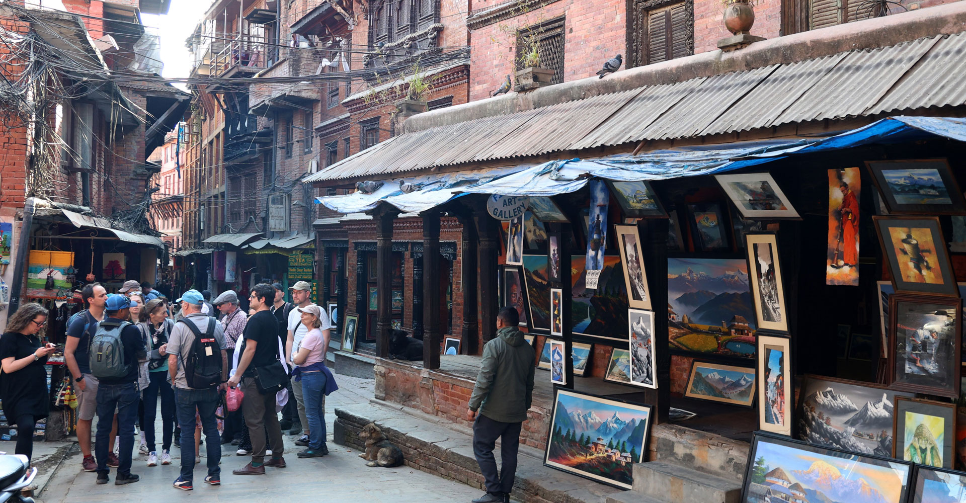 विभिन्न देशबाट नेपाल घुम्न आएका विदेशी पर्यटक भक्तपुर क्षेत्र अवलोकन गर्दै