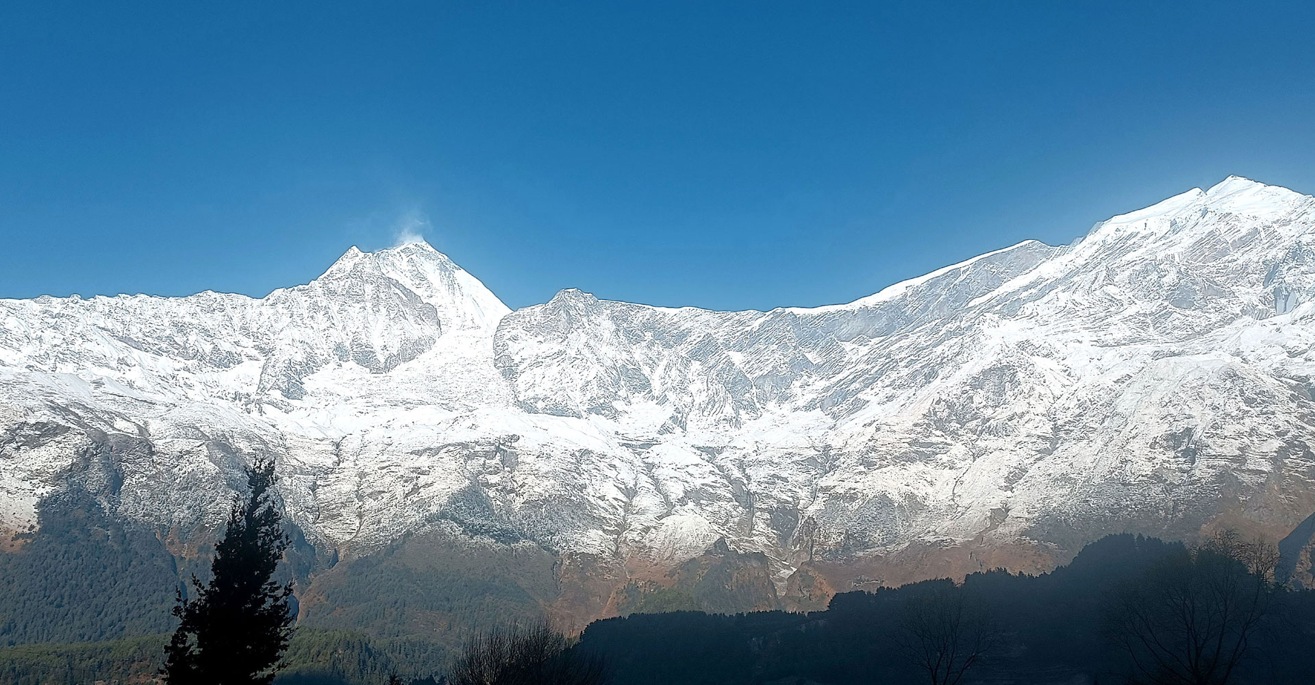 मङ्गलबार बिहान मुस्ताङबाट देखिएको सेताम्मे धौलागिरि हिमाल । सोमबार दिउँसो मुस्ताङमाआंशिक हिमपात भएपनि यस वर्ष अझै गतवर्षहरु जस्तो धेरै हिमपात हुन सकेको छैन