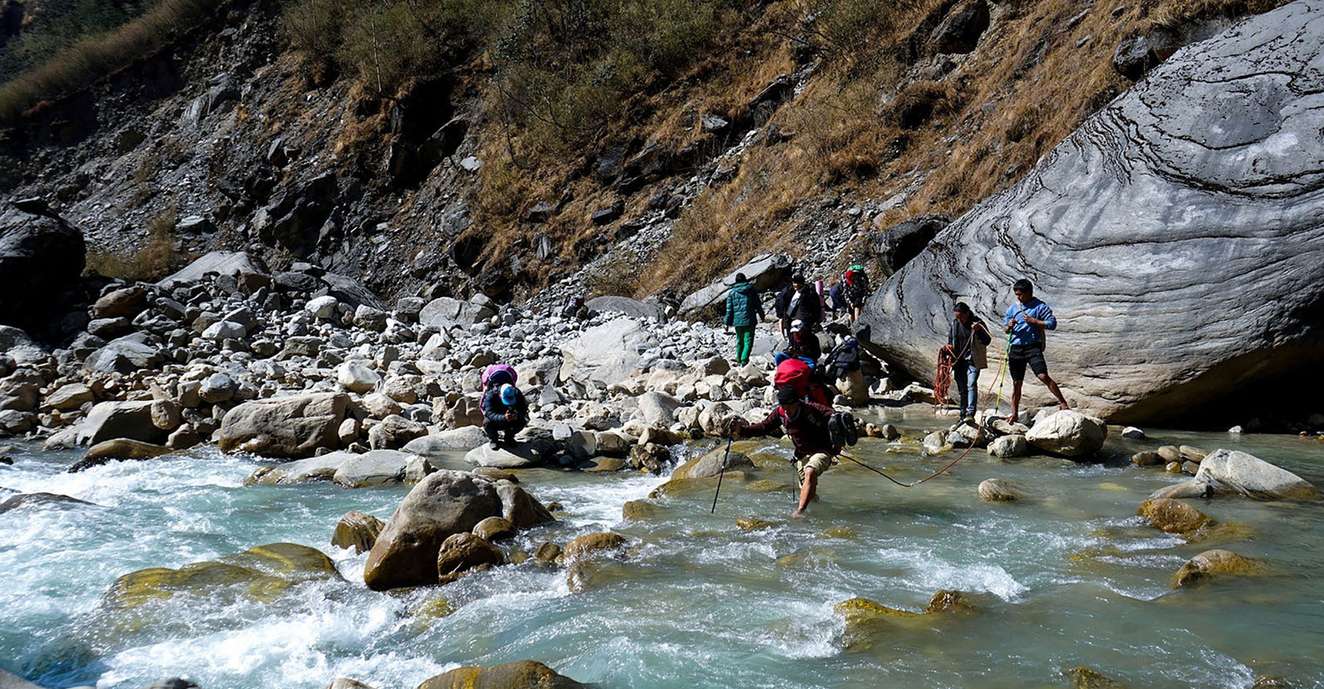 म्याग्दीको रघुगङ्गा गाउँपालिका–७ चिमखोलाको सुगुरथला देखि धौलागिरि हिमालको आधार शिविर जाने क्रममा राहुघाट खोला तर्दै पदयात्रीहरु । धौलागिरि आइसफल र सेञ्चुरी पदमार्गमा पर्ने यस क्षेत्रमा आवत जावतका लागि झोलुङ्गे पुलको आवश्यकता छ