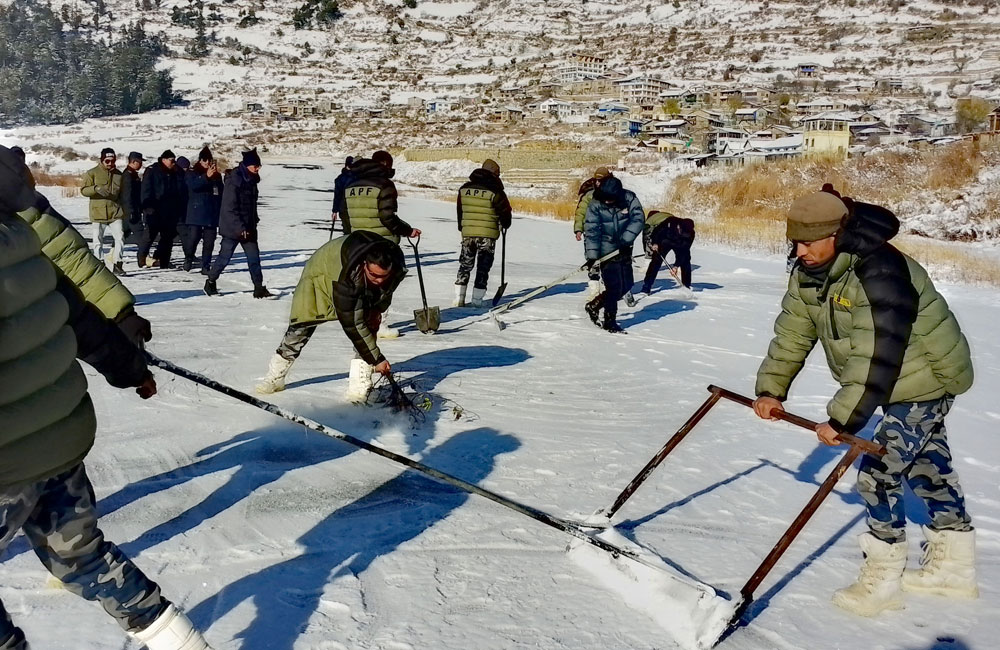 थप पढ्नुहोस्सिमकोट, (हुम्ला), २५ मङ्सिरः हुम्लामा आइतबार रातिदेखि सोमबार दिउँसोसम्म निरन्तर हिमपात भएपछि अवरुद्ध सिमकोट विमानस्थलमा जमेको हिउँ पन्छाएर आज हवाई