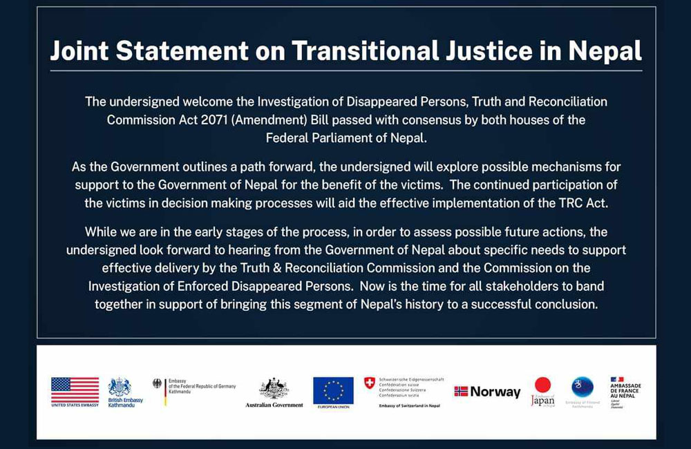 १३ भदौ, काठमाडौं । अमेरिकासहित १० देशले सत्य निरूपण तथा मेलमिलाप आयोग र बेपत्ता नागरिक छानबिन आयोगसम्बन्धी (टीआरसी) विधेयकको स्वागत