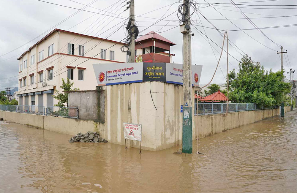 २२ साउन, काठमाडौं । सोमबार राति र मंगलबार बिहानभर परेको वर्षाका कारण ललितपुर च्यासलस्थित नेकपा एमालेको पार्टी कार्यालय फेरि डुबानमा