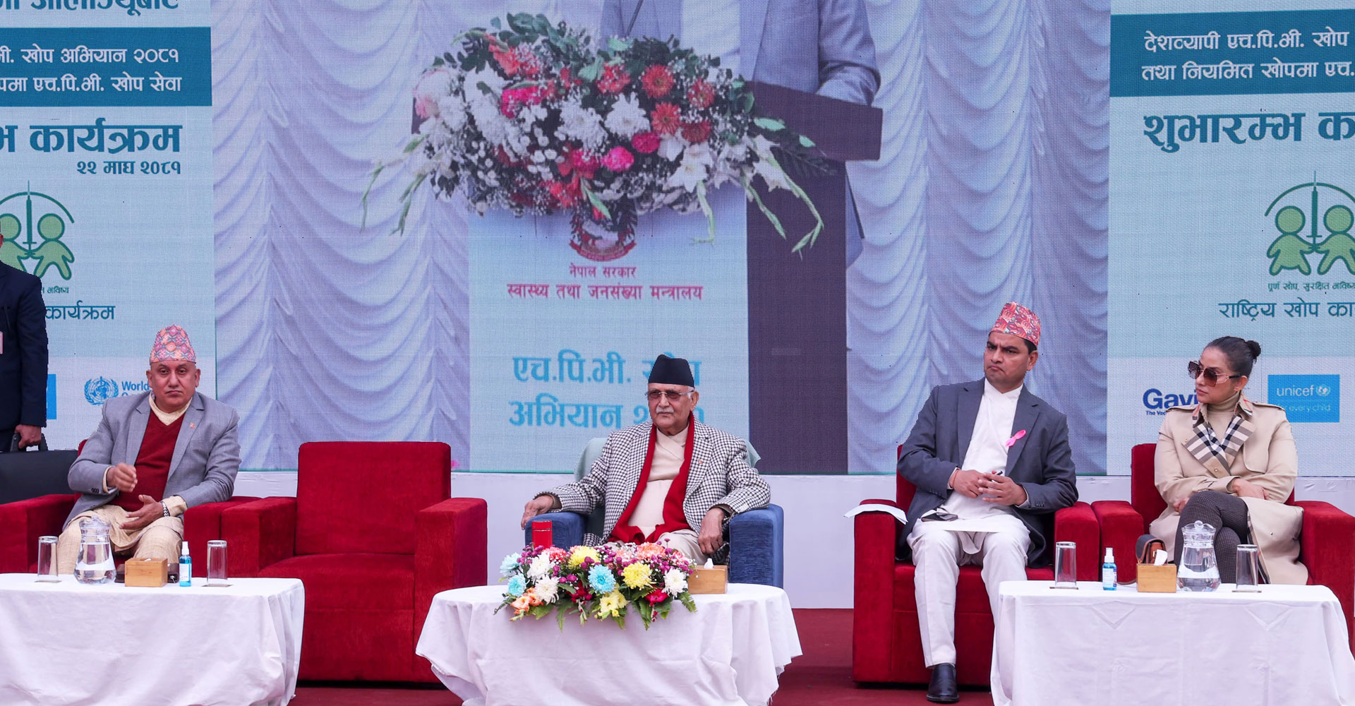 थप पढ्नुहोस्काठमाडौंँ, २२ माघः प्रधानमन्त्री केपी शर्मा ओलीले विश्व क्यान्सर दिवसका अवसरमा किशोरीलाई पाठेघरको मुखको क्यान्सरविरुद्धको एचपिभी खोप अभियानको शुभारम्भ गर्नुभएको