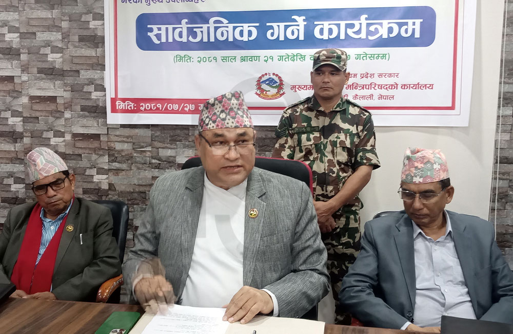 थप पढ्नुहोस्२७ कात्तिक, कैलाली । सुदूरपश्चिम प्रदेशका मुख्यमन्त्री कमलबहादुर शाहले आफ्नो नेतृत्वको प्रदेश सरकारको एक सय दिनको उपलब्धि सार्वजनिक गर्नुभएको छ