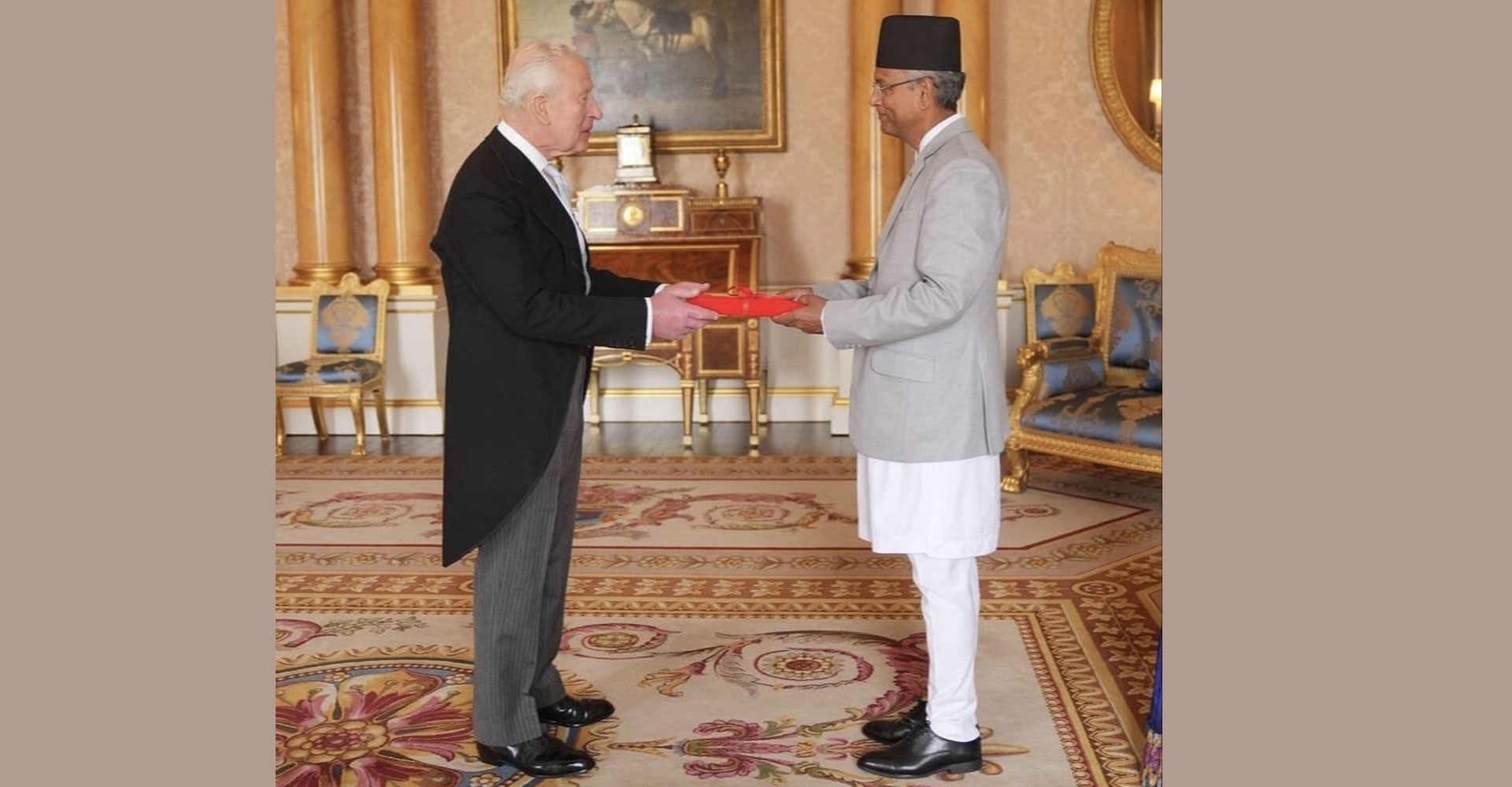 काठमाडौँ, १९ वैशाखः संयुक्त अधिराज्यका लागि नेपालका राजदूत चन्द्रकुमार घिमिरेले राजा चाल्र्स तृतीयसमक्ष आफ्नो ओहोदाको प्रमाणपत्र प्रस्तुत गर्नुभएको छ ।